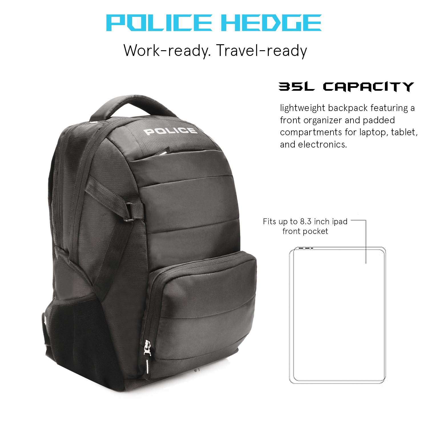 Utility: Discover the 35-litre exquisite POLICE Backpack designed for men and women. It’s crafted with meticulous attention to detail, featuring two padded shoulder straps and an anti-sweat cushioned back panel for maximum comfort. It comes with two spacious main compartments, one with a padded laptop sleeve that securely fits laptops up to 15 inches. With multiple zipped sections and two handy front pockets, it keeps all your essentials neatly organized.