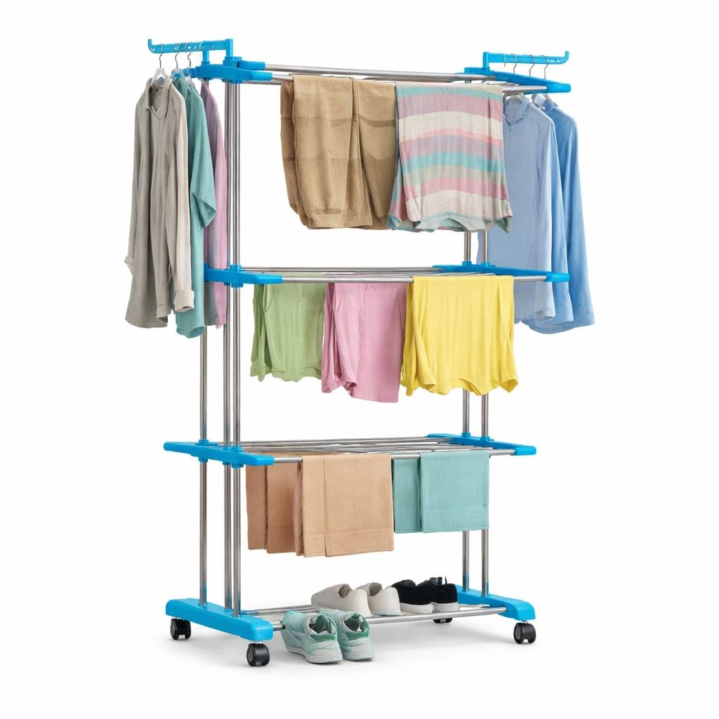 Home Home Premium Clothes Drying Stand for Drying, Stainless Steel 3 Tier Clothes, Foldable Clothes Stand for Drying with Wheels, Foldable and Movable kapde sukhane ka Stand (Pack of 1,Blue)