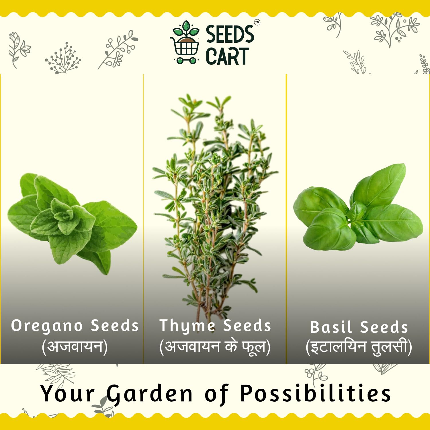 Herb Seeds Combo Include – 1 * Pack of Italian Basil seeds (Tulsi seeds) (approx 155), 1 * Pack of Oregano seeds (Ajwain seeds) (approx 300), 1 * Pack of Thyme seeds (Ajwain) (approx 45), 1 * Pack of Chives seeds (Patta Pyaz seeds) (approx 100), 1 * Pack of Sage seeds (Salvia seeds) (approx 20).