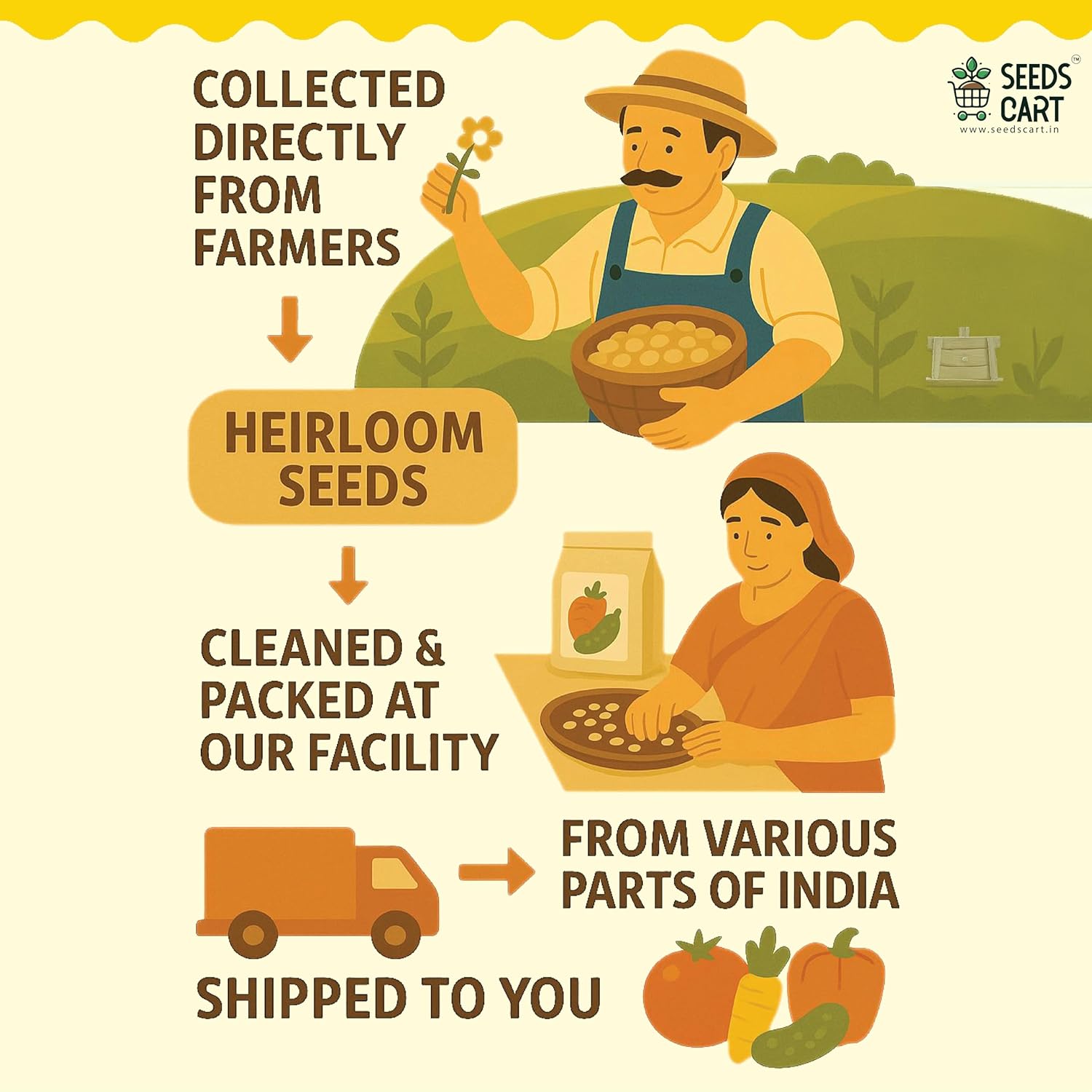 Seeds Cart is a homegrown Indian brand that offers high-quality, non-GMO, open-pollinated seeds for vegetables, herbs, and flowers, helping people grow their own food at home.