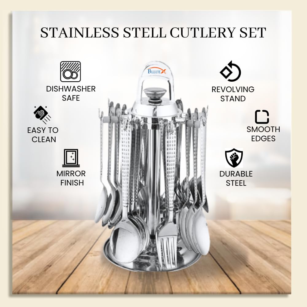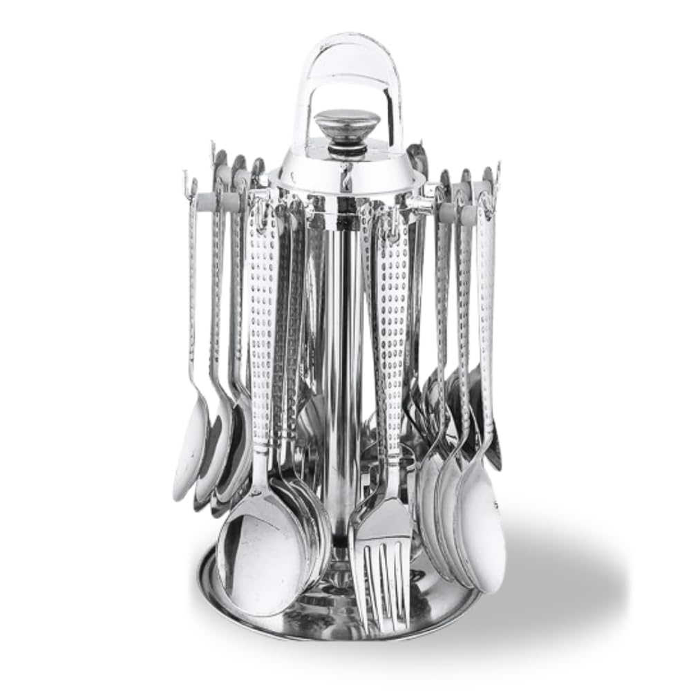 Set Composition: It includes 6 Dessert Spoons, 6 Dessert Forks, 6 Tea Spoons, 6 Soup Spoons, and a convenient stand for storage
