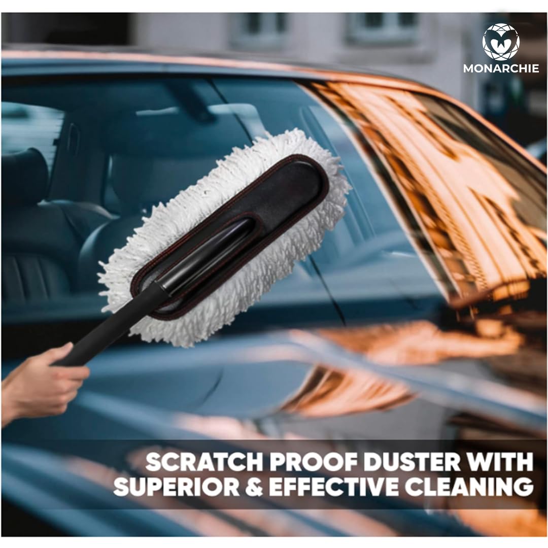 It is made from specially wax treated cotton strands which lift the dust without scratching the paint