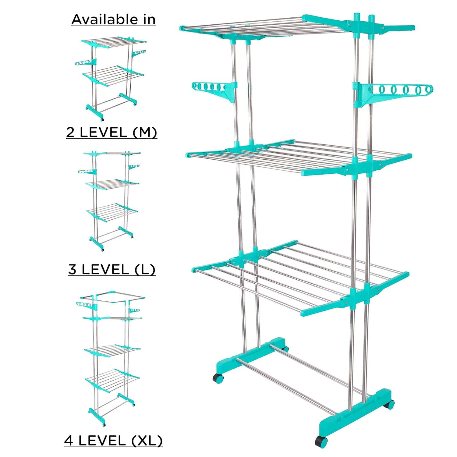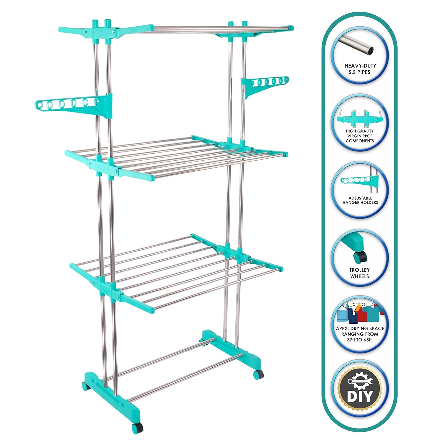 LiMETRO STEEL Stainless Steel Double Pole 3 Layer Stainless Steel Cloth Drying Stand with Hanger