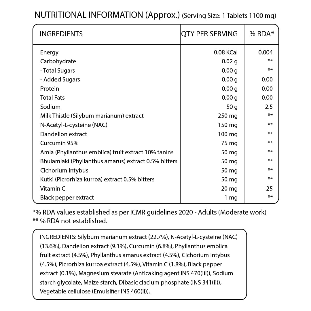 INGREDIENTS: Milk Thistle- helps to improve liver function. N-Acetyl L- Cysteine- It is a potent antioxidant and a precursor to glutathione, which promotes natural detoxification of the liver. Cichorium intybus powder- helps to protect liver and promotes detoxification. Phyllanthus amarus- It helps prevent liver inflammation and damage. It also reduces the risk of kidney stones. Dandelion extract: It helps reduce stress on the liver and supports the liver’s ability to produce bile.