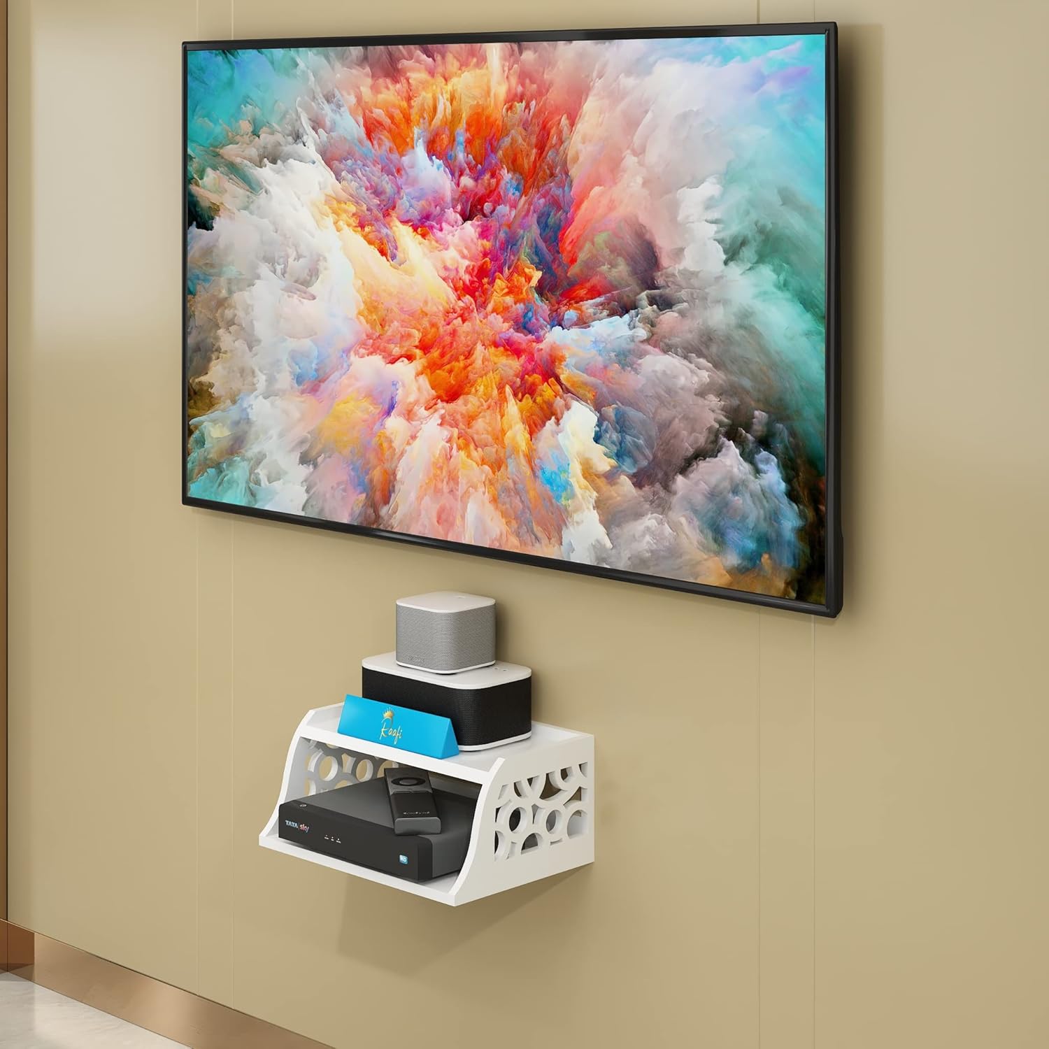 Suitable for all types of small Set Top Box Durable & Stylish design. Easy to mount with all necessary hardware Included. Hardware is not visible when mounted.Decorative and functional for your home dining room, living room, office.Attractive storage and display solution for housing your favorite collectible items, framed photos, souvenirs, candles, and other small items