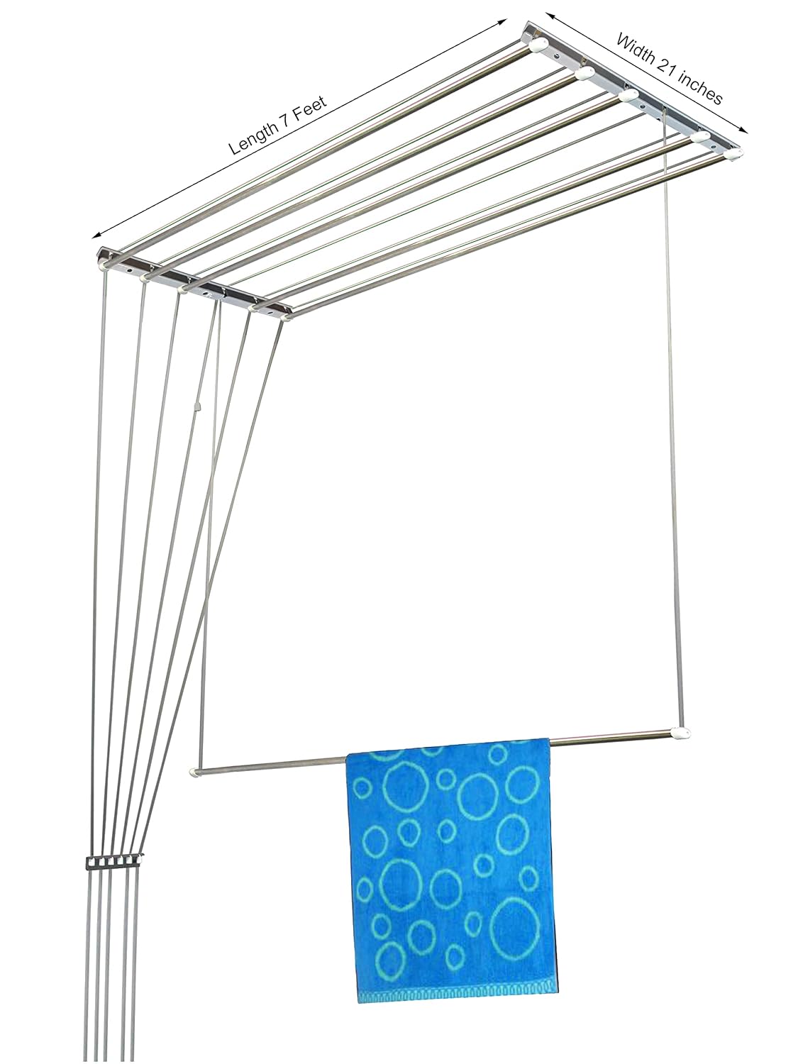 Features : Drying Space: 42 Feet, Length: 7 Feet, No of Pipes: 6, having 13mm Diameter. Dimensions(inches): 22 x 84 x Adjustable Height suitable for a Ceiling space(inches) of 26 x 92 and above.
