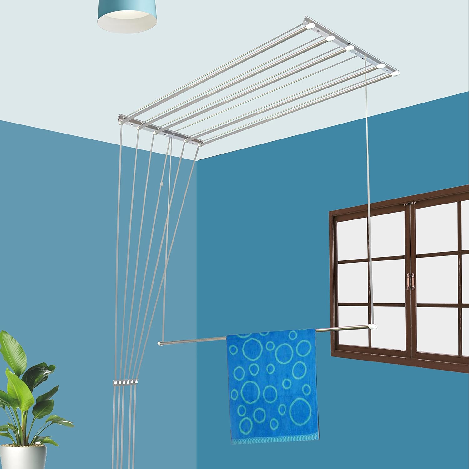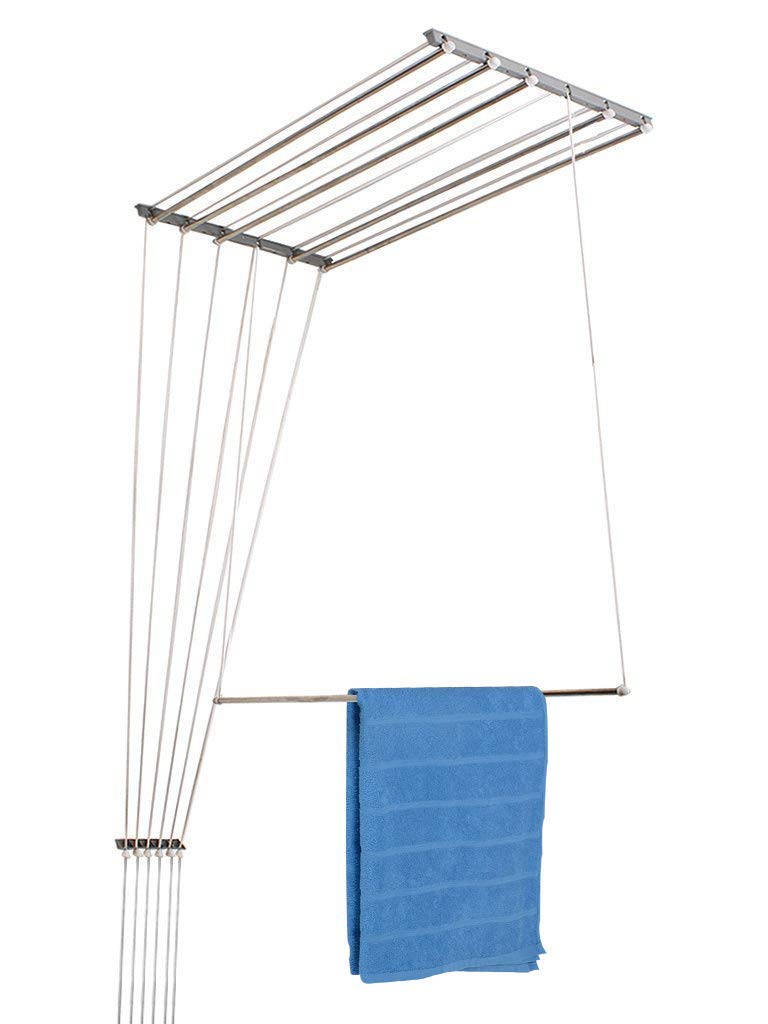 Takes up zero floor space. Can be pulled down conveniently via high ABS pulley mechanism. Straight rods are very useful for drying large clothes like sarees, bedsheets, etc. Ideal for placement in your balcony or passage.