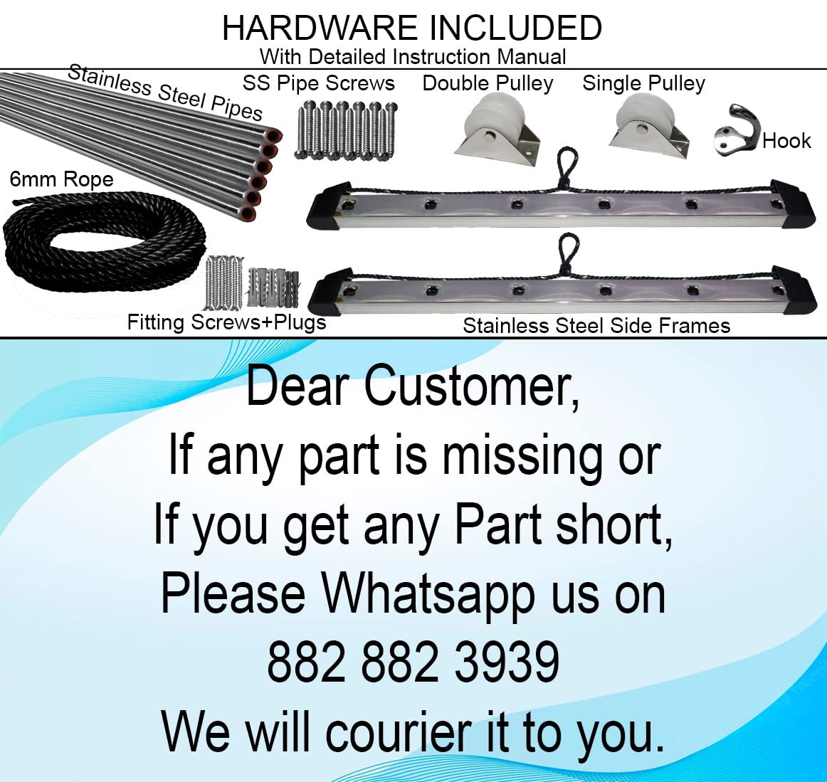 LONG LIFE & WARRANTY – 1 Year Rainbow Drywell Warranty for Pipes and Ropes in case of rust or breakage. Our Cloth Dryer stand uses High Quality Stainless Steel 202 and not low grade JT steel as used by other cloth dryers. Smooth metal pulley mechanism helps move the rack up and down easily with a wall hook that lasts long. Use of this product is not recommended within 2 kilometers of any salt water body or under open weather conditions.