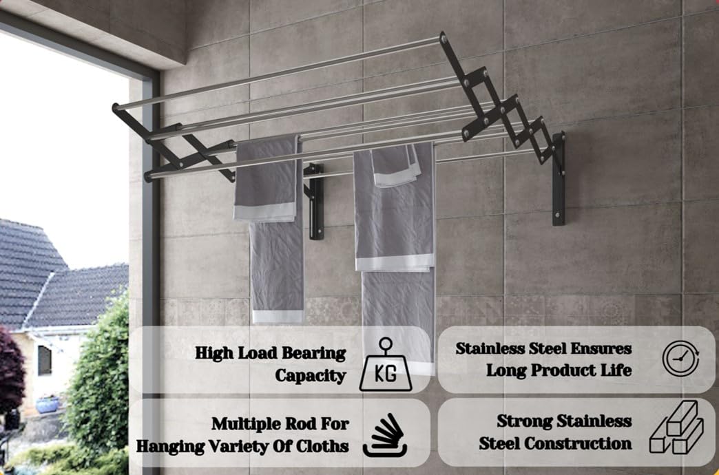 Home Home RIOMAX Heavy Duty Rust-Free Stainless Steel Foldable Wall Mounted/Mounting Clothes Drying Stand/Cloth Dryer Racks for Bathroom/Balcony/Indoor/Outdoor (4 Ft – 9 Rod – Black & Silver)