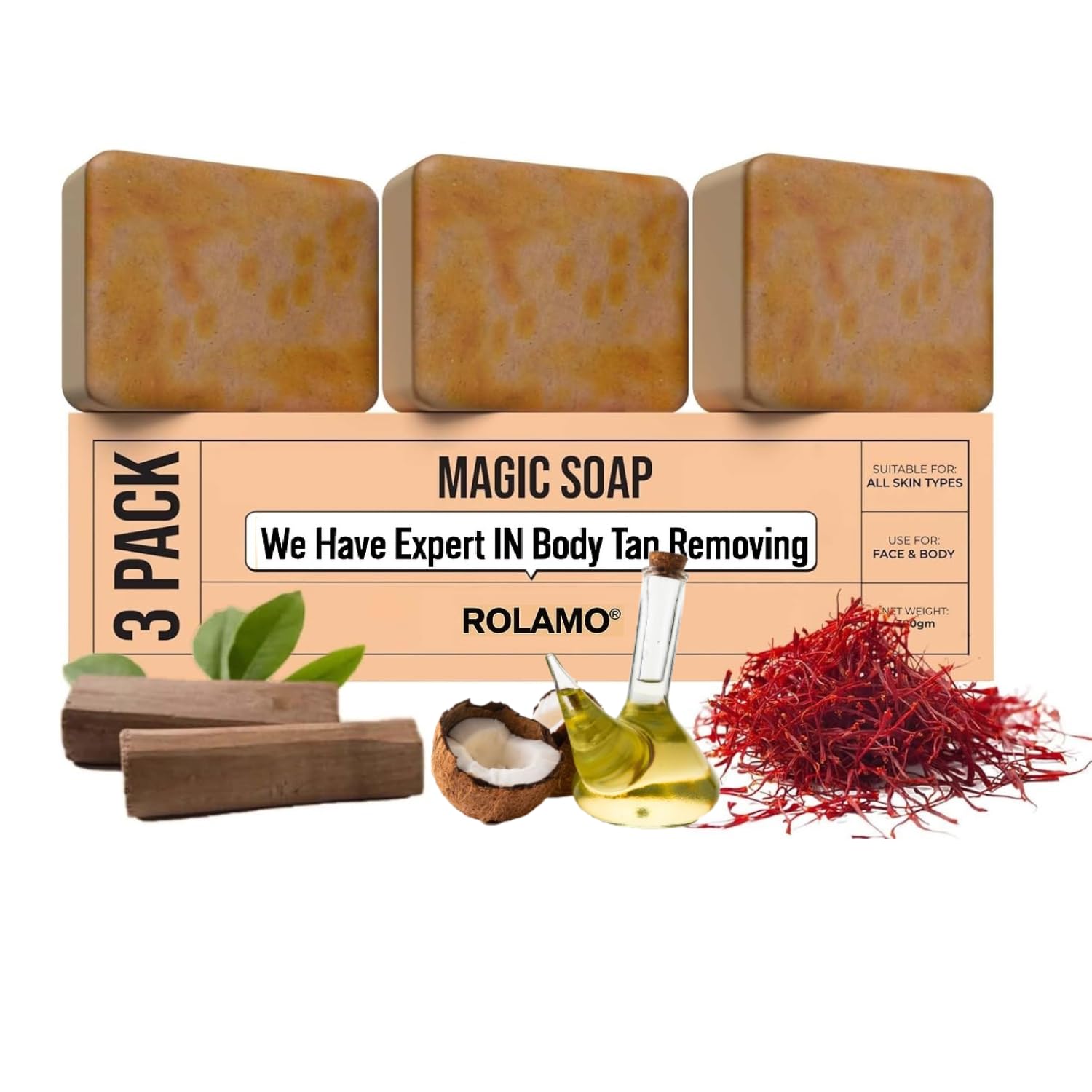 PACK CONTENTS: premium magic soaps enriched with natural sandalwood and saffron extracts for effective body tan removal