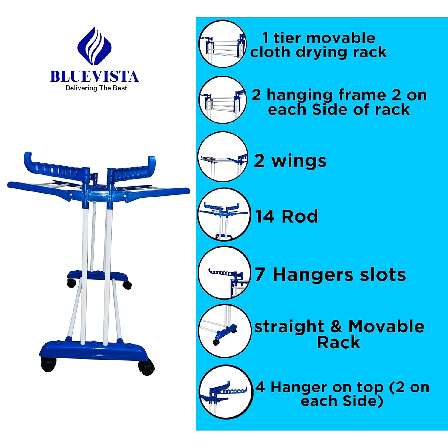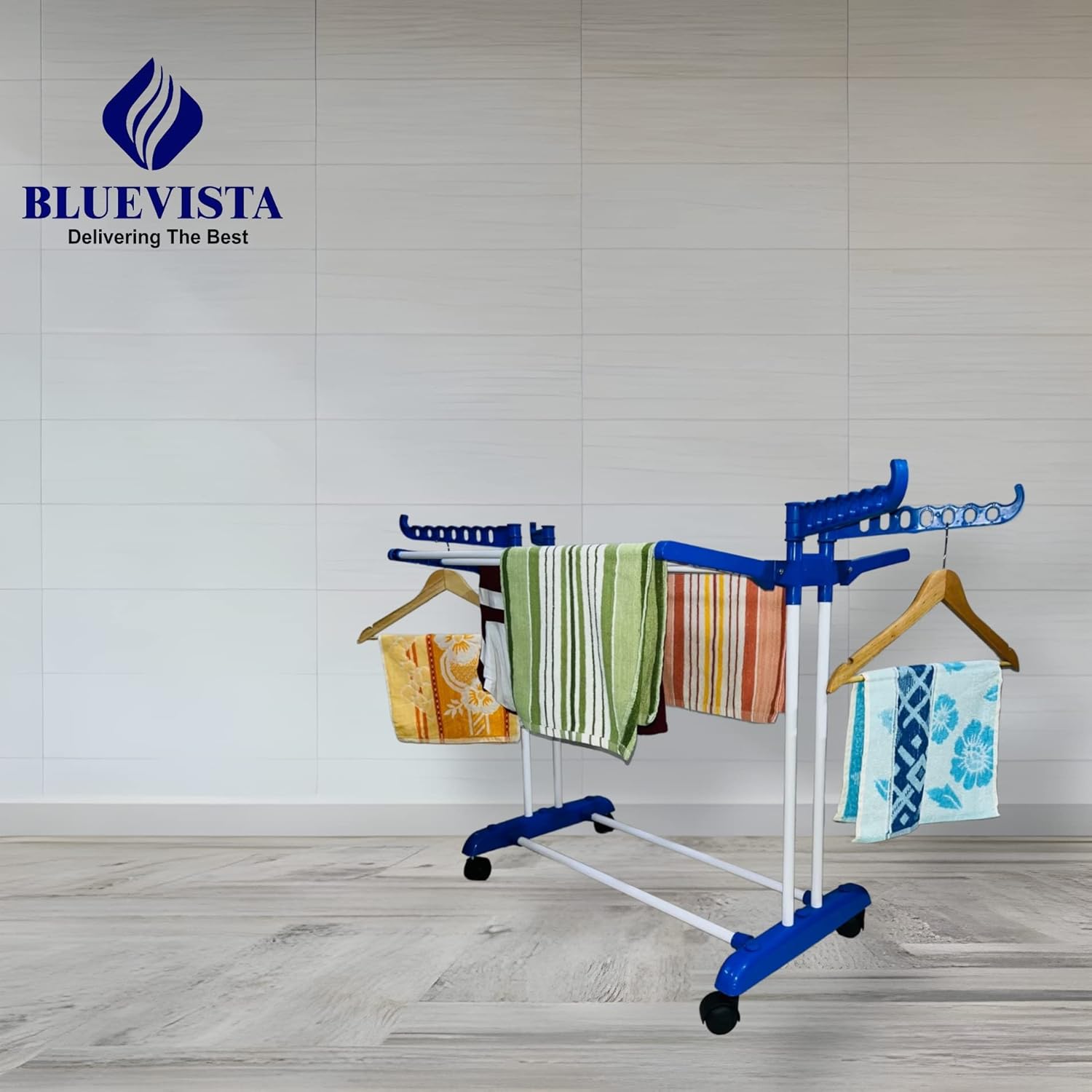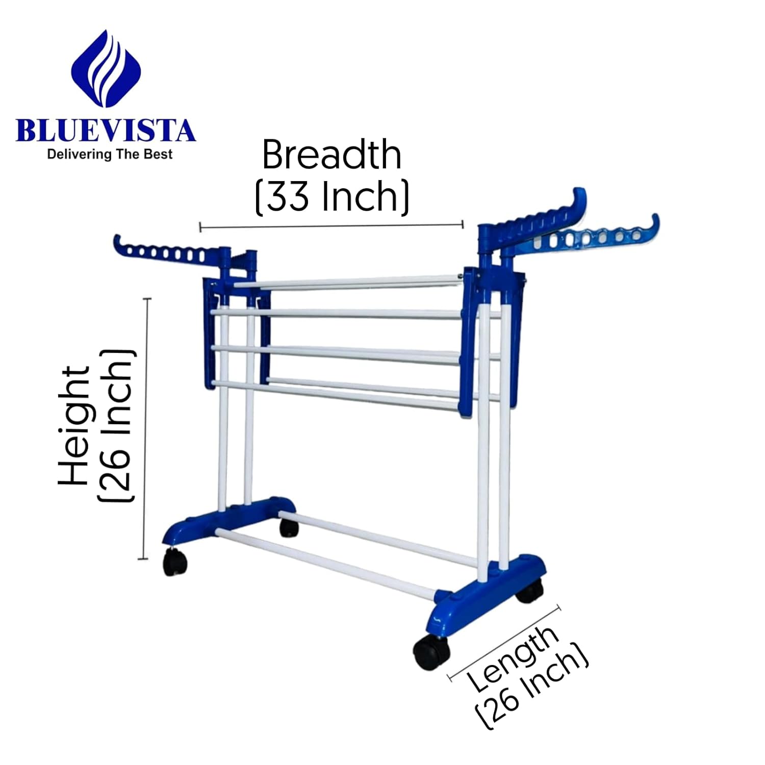 Bluevista royal jumbo white cloth drying stand easy to use and carry with 4 Rotating Wheels allow the unit to be moved anywhere when loaded. The stand is made of mild steel pipe with powder coated. It is rustproof and the pipe is of 3/4″ is used to make the stand. Look very adorable. It is easily foldable. It is used both indoor and outdoor. When not in use you can fold it. It is moisture, rust proof also. It has 6 hanging frames 4 rails on each for drying lots of cloths. In this stand having much space for drying clothes. Easy to assemble and ready to use.