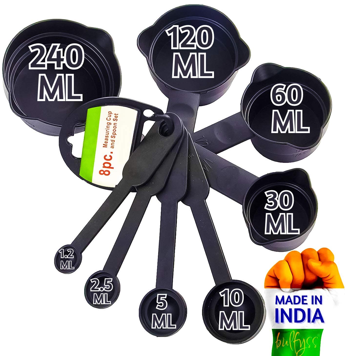 08 Piece Set (4 Measuring Cups And 4 Measuring Spoons) In Different Gradated Sizes & Clearly Mentioned Size In Different Units on Each Cup & Spoon