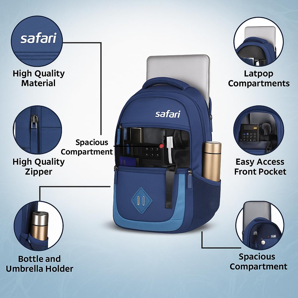 Safari Omega Pro 35L Laptop Backpack with Raincover, 3 compartments, bottle holder, organizer, school bag for boys and girls, college bag for women and men, office bag, travel bag