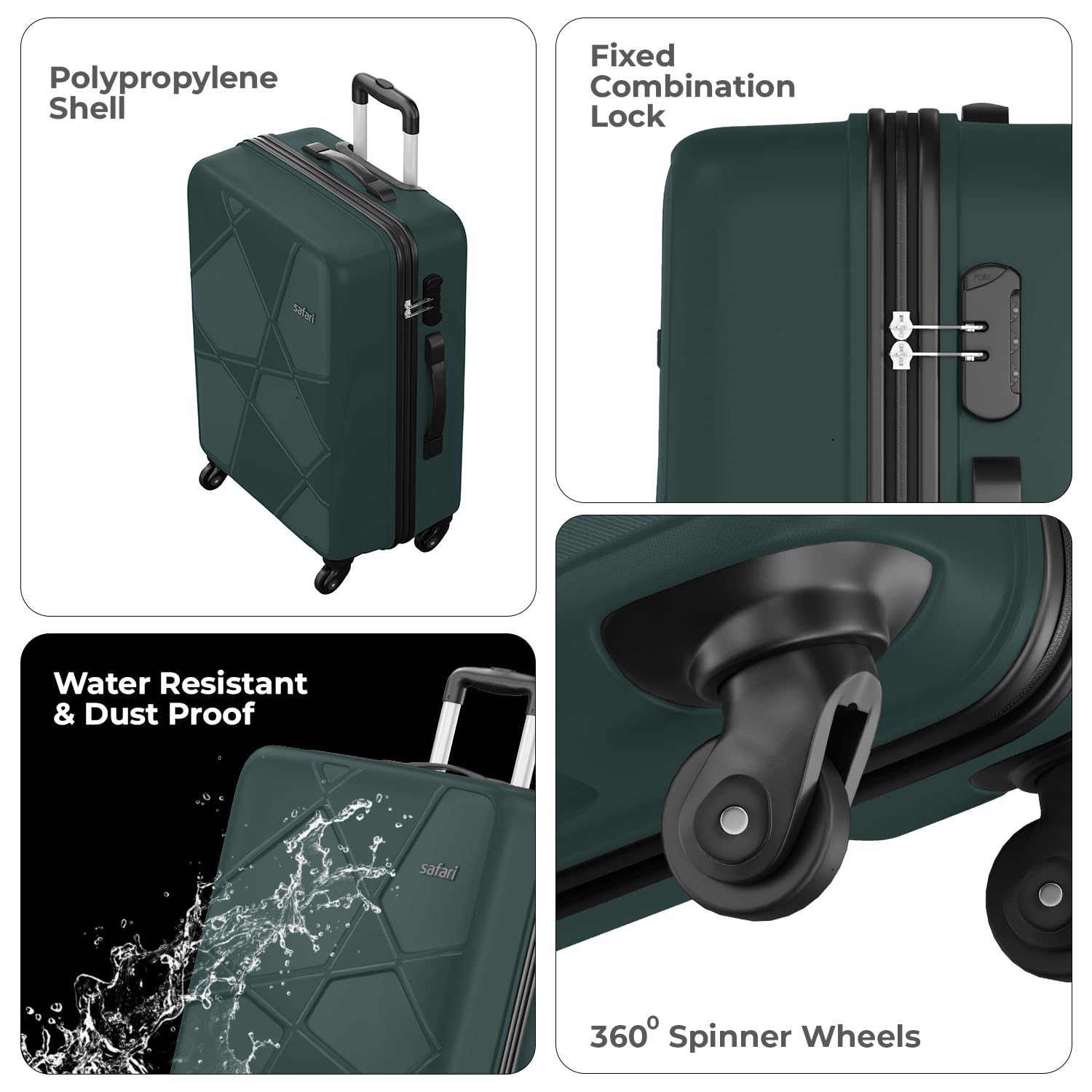 Safari Pentagon is the perfect blend of style, durability and convenince for today’s traveler. Crafted from high grade impact resistant Polypropylene material, this trolley bag is designed to withstand the rigors of modern travel. The multi-stage trolley system with 360 degree spinner wheels offers effortless maneuverability. Navigate tight spaces and sharp corners with ease, making your travel experience smoother. The spacious interior is desgined for organized packing. Ideal for business trips, vacations and adventures, this suitcase accommodates all your essentials with ease. The 3 digit combination lock makes sure your belongings are safe. The 3 year international Warranty ensures we have got you covered on all your trips.