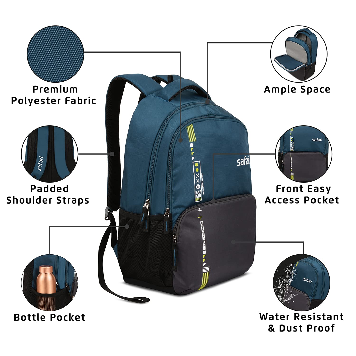 Safari Quill is a 26 Litres, 2 compartment laptop backpack perfect for daily usage. It has a dedicated tech safe laptop sleeve that can hold upto 17 inch laptop or any smaller ones easily. The laptop sleeve is also fully padded from the bottom protecting your device from any shock or damage. This backpack is especially designed for todays fast paced world, where everything should be compact and lightweight. This backpack is perfect for everyday usage such as college, school, tuitions, or short holiday trips. The front pocket is designed to keep your essentials organized and side mesh pockets are perfect for storing your water bottle and umberella. Made of high grade water resistant polyester fabric, this backpack will last you several trips.