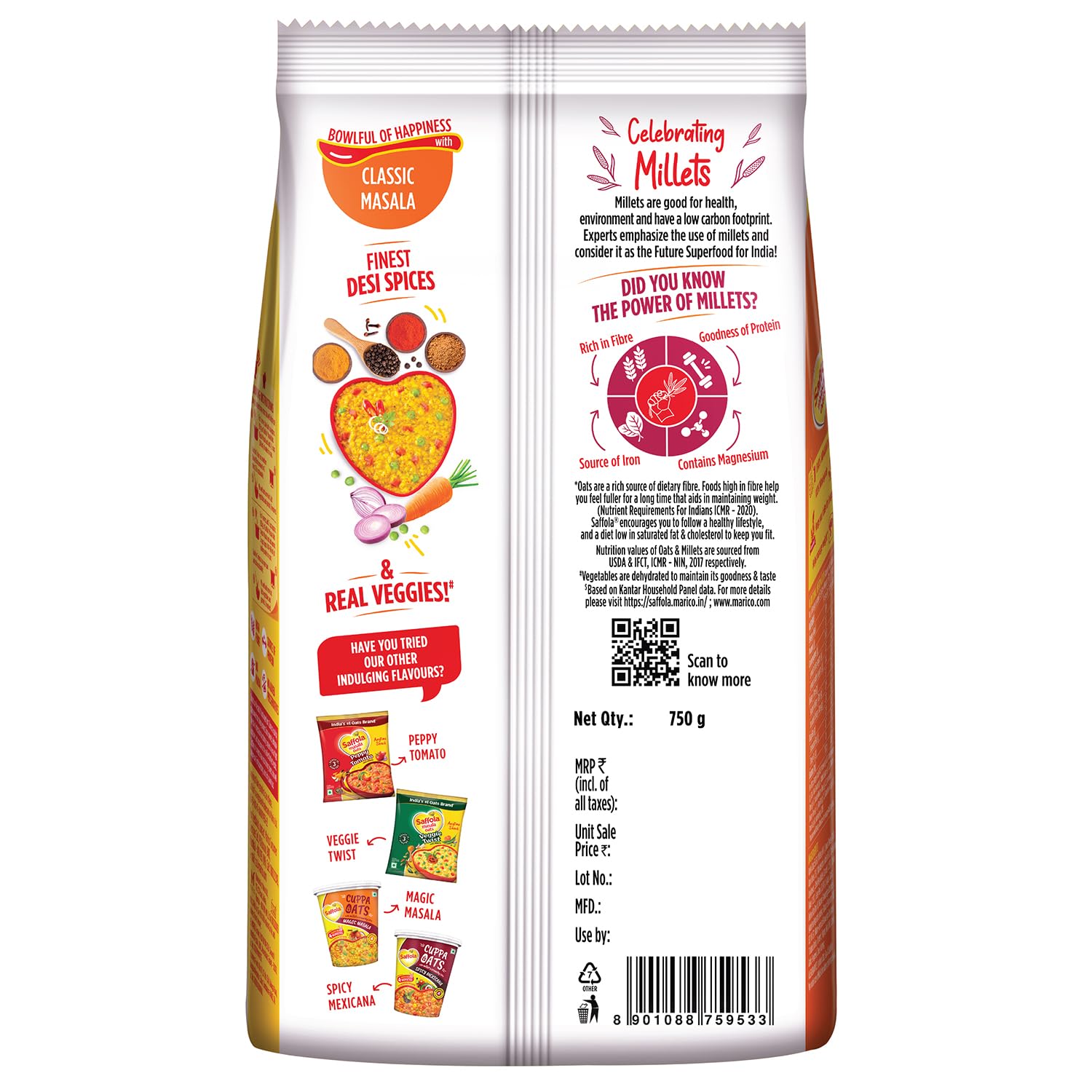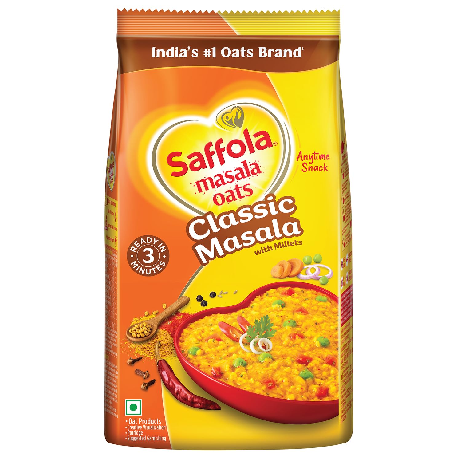 Saffola Masala Oats, brings to a range of delightful flavours for a delicious anytime snack. It is made with wholegrain oats, real vegetables, & chatpata mix of spices to give you a delectable warm bowl of enjoyment that balances out chatpata cravings with health. What’s more is that it gets ready to eat in just 3 minutes, so that you can enjoy this delicious healthy snacks whenever you want! Devour it as a snack for anytime taste cravings or as a delicious and delightful family breakfast cereal! Available in a range of yummy flavours – Classic Masala : for the classic masaledar experience | Veggie Twist: for the comforting blend of spices and vegetables | Peppy tomato: for a tangy indulgence | Masala Coriander: for the aromatic coriander flavour. Order your pack of this delicious healthy snack today and say bye to your chatpata cravings! Did you know? Saffola Masala Oats is made with wholegrain oats , a cereal that is high in fibre and in protein, which keep you fuller for longer, controls your hunger pangs and thereby helps you manage weight.