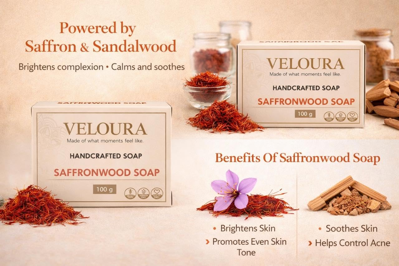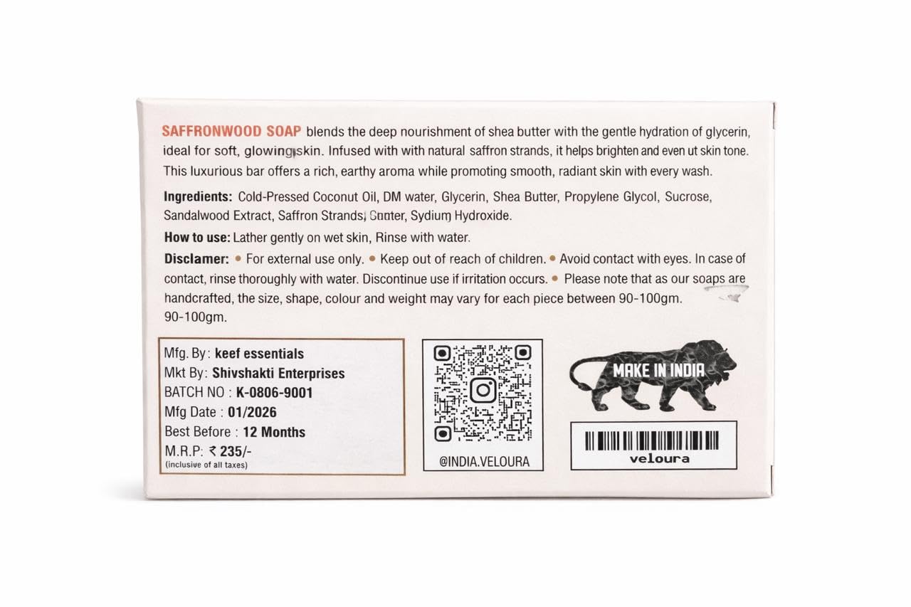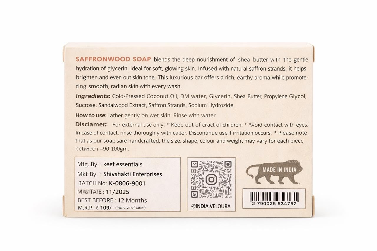 Pamper your skin with the luxurious Saffronwood Soap Pack of 2 (200g), enriched with cold-pressed coconut oil, shea butter, saffron strands, and sandalwood extract. This handmade soap gently cleanses, moisturizes, and brightens your skin while helping to even out skin tone. The natural goodness of saffron and sandalwood soothes, nourishes, and rejuvenates, leaving your skin soft, radiant, and refreshed. Perfect for daily use, this soap is suitable for all skin types and free from harsh chemicals.