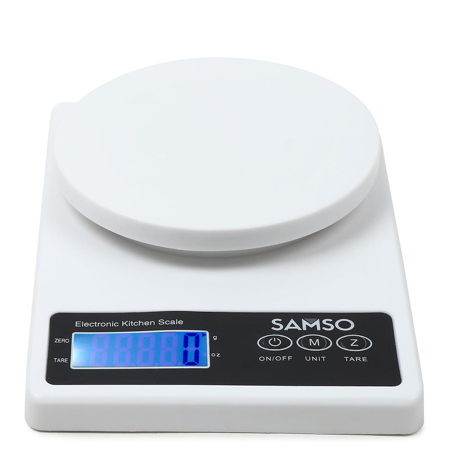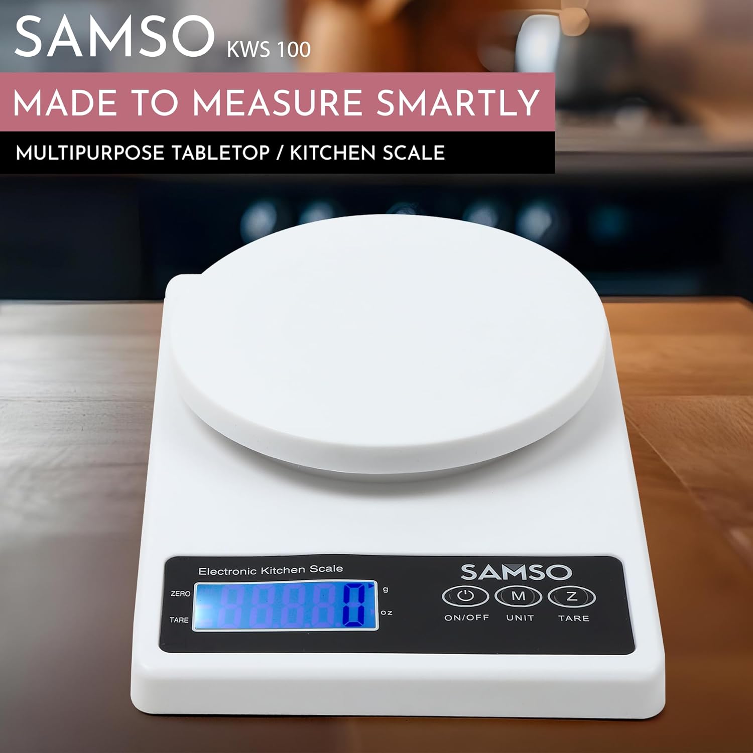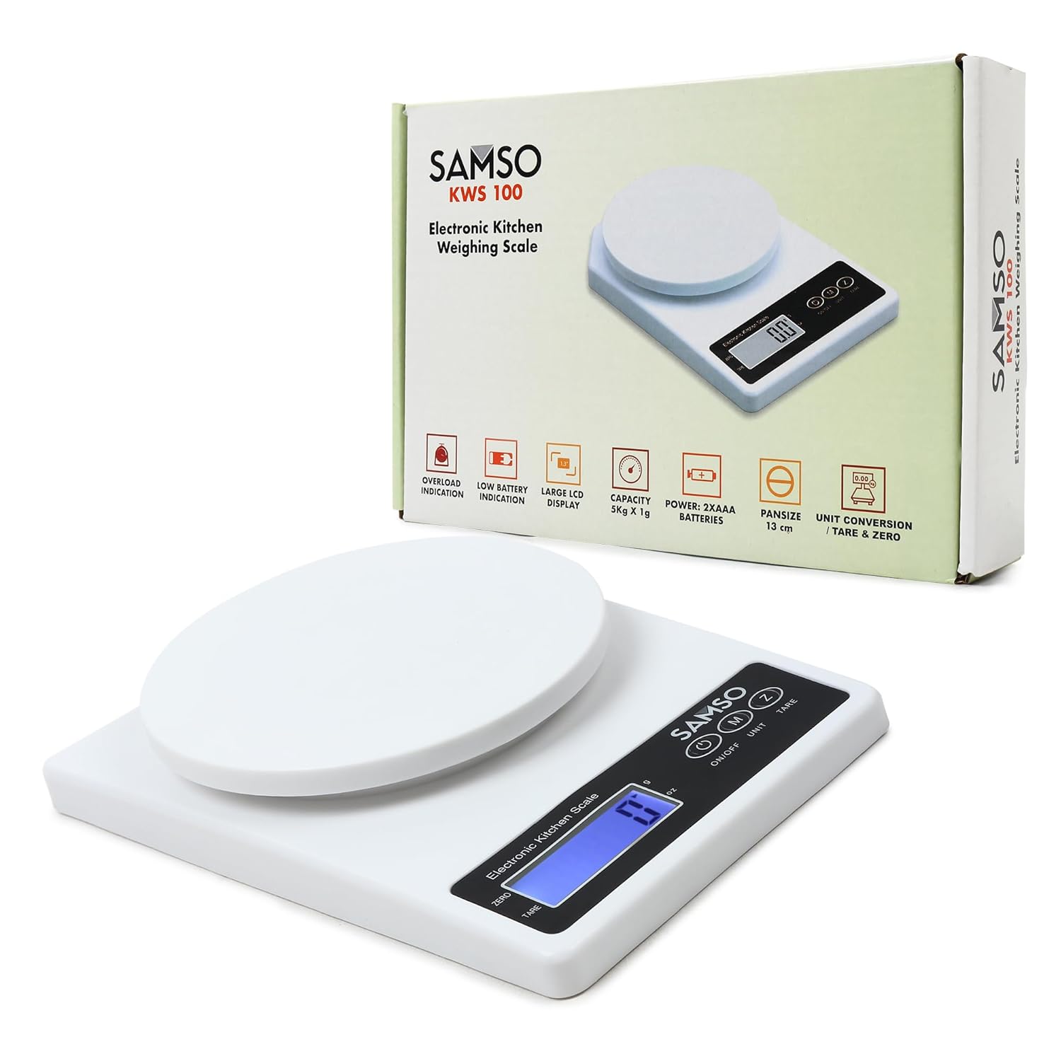 Home Scale SAMSO Digital Kitchen Weighing Scale & Food Weight Machine for Health, Fitness, Home Baking & Cooking with Free Bowl, 2 Year Warranty & Batteries Included (KWS 100 – White)