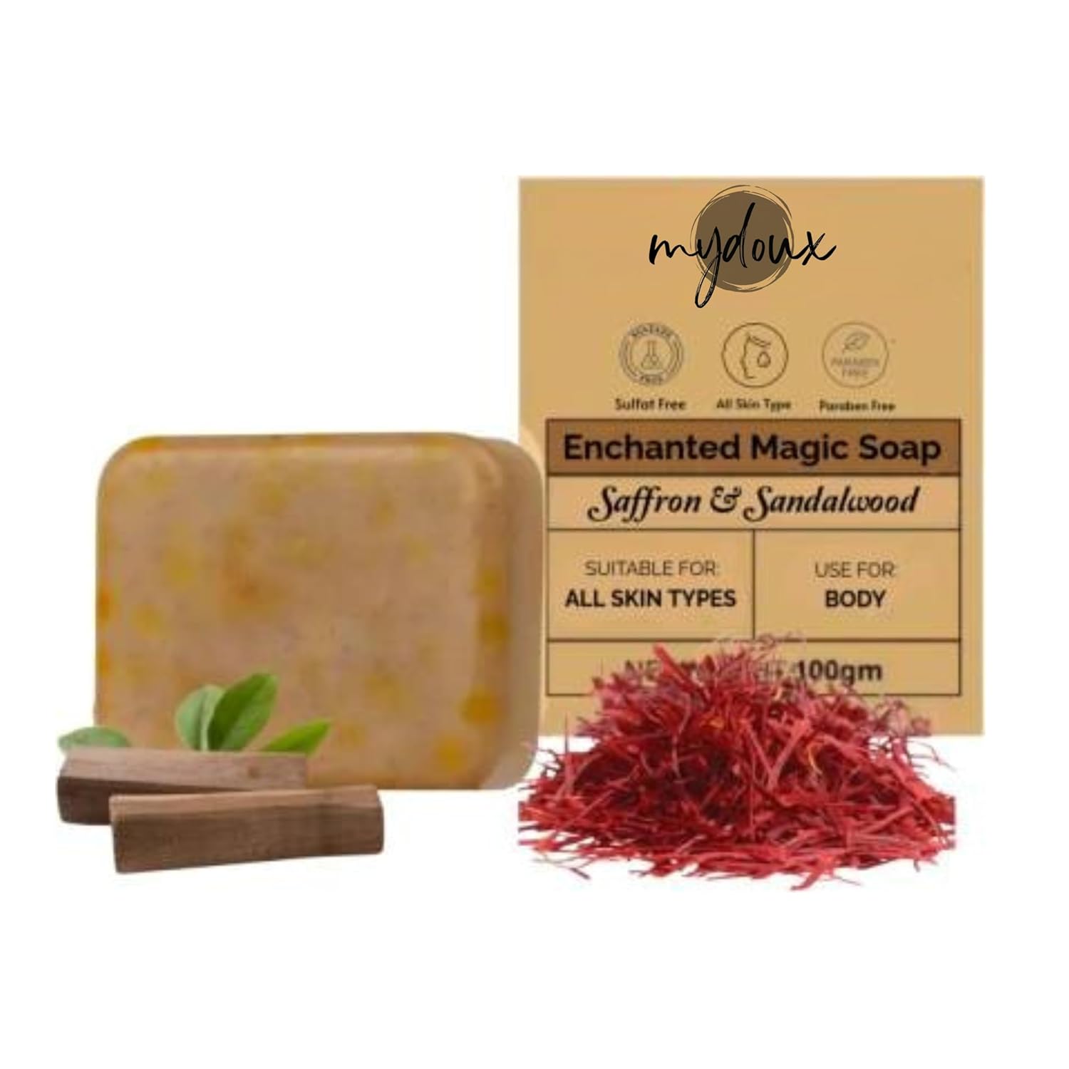 Experience the luxurious blend of tradition and skincare with our Sandalwood & Saffron Magic Soaps. Expertly crafted using the finest natural ingredients, this handmade soap combines the richness of Chandan (Sandalwood) and Kesar (Saffron) to give you a bathing experience like no other. Perfectly suitable for both men and women, it rejuvenates your skin, leaving it radiant, glowing, and beautifully fragrant.