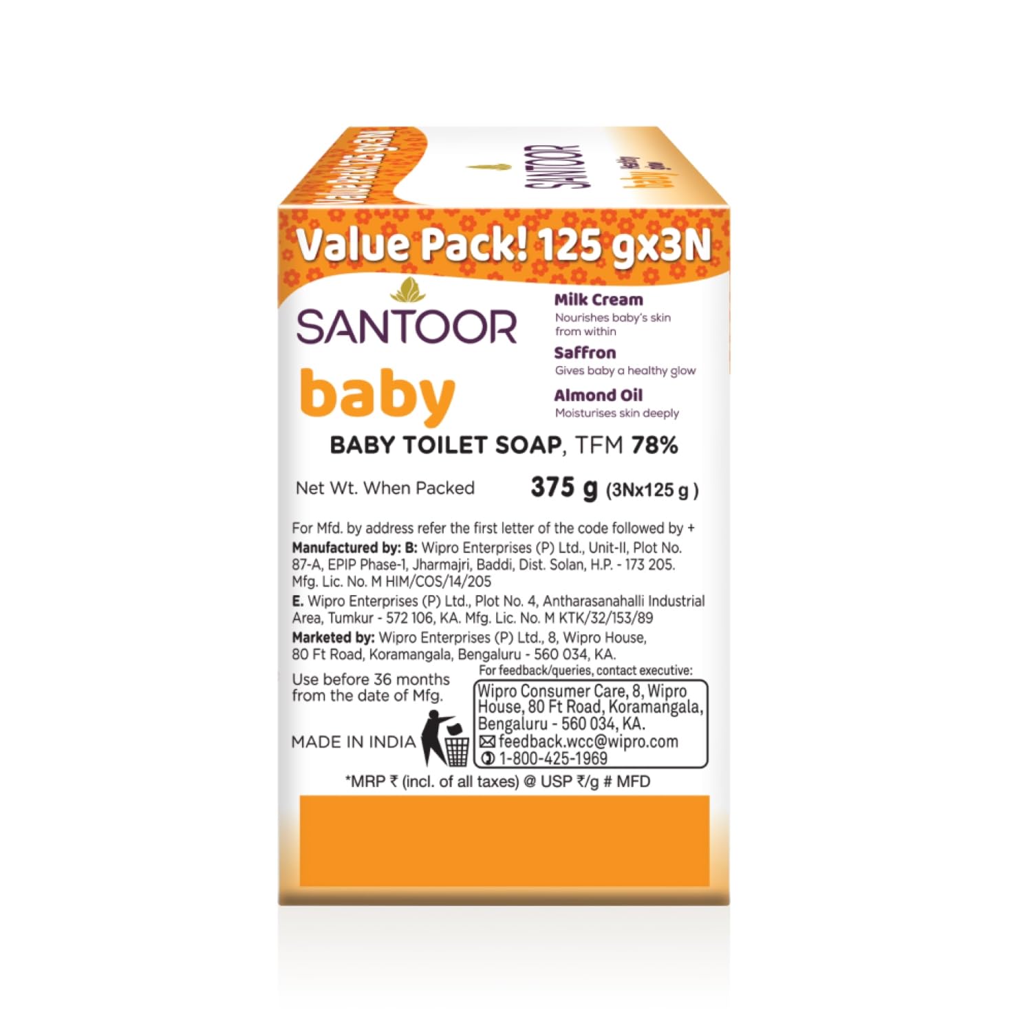 Introducing Santoor Baby Soap with Milk Cream, Saffron, and Almond Oil – a gentle touch of love for your little one’s delicate skin. Pamper your baby with a soap that combines the goodness of nourishing ingredients and the assurance of harmlessness. Enriched with milk cream, saffron, and almond oil, this soap provides gentle care while keeping your baby’s skin soft, supple, and oh-so-kissable. Say goodbye to worries as you cleanse your baby’s skin with a soap that is dermatologically tested, free from harsh chemicals, and designed to maintain the natural balance of your baby’s precious skin. Embrace the delicate fragrance that lingers, a reminder of love and tenderness wrapped around your baby with every bath. Santoor Baby Bar Soap is the result of Santoor’s commitment to quality and excellence. With over 36 years of expertise in skincare, Santoor has become a trusted brand, beloved by millions of women across the country. Each bar of soap is meticulously crafted, ensuring that you receive the highest level of efficacy and satisfaction. Choose Santoor Baby Soap with Milk Cream, Saffron, and Almond Oil to provide gentle and nourishing care for your baby’s delicate skin.