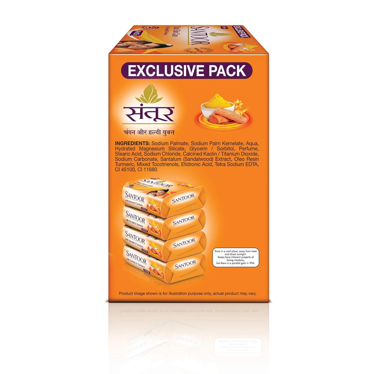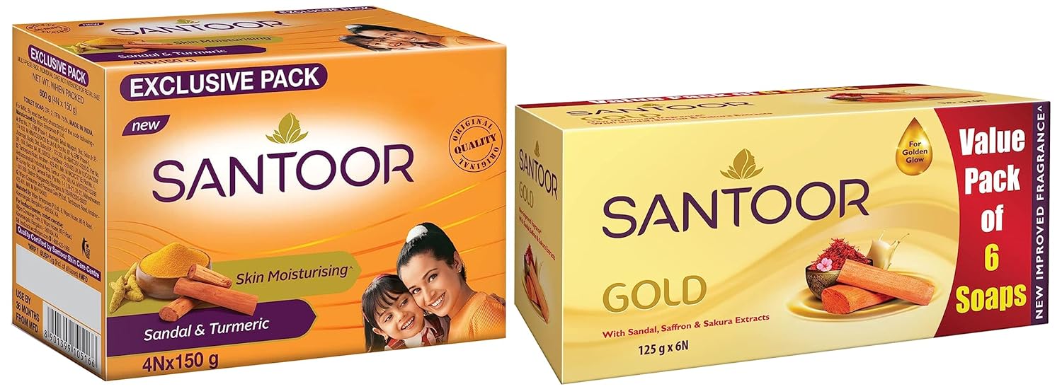 Santoor Sandal & Turmeric Soap for Total Skin Care, 150g (Pack of 4)Santoor has grown from a traditional south Indian soap to a modern beauty soap that carries the secret of younger looking skin for women of different age groups. Sandal and Turmeric have been an essential part of Indian woman’s skin care regimen for centuries. The deep acting ingredients of Turmeric and Sandal in the soap provide a smooth, soft and clear skin while also giving a youthful glow to the skin. It has fresh, energizing and a long-lasting fragrance.Santoor Gold Soap with Saffron, Sandal & Sakura Extracts, 125g (Pack of 6)Flaunt a royal glow amidst all the dust and pollution, with Santoor gold. Made with a perfect blend of Kashmiri saffron, sandalwood and sakura extracts.