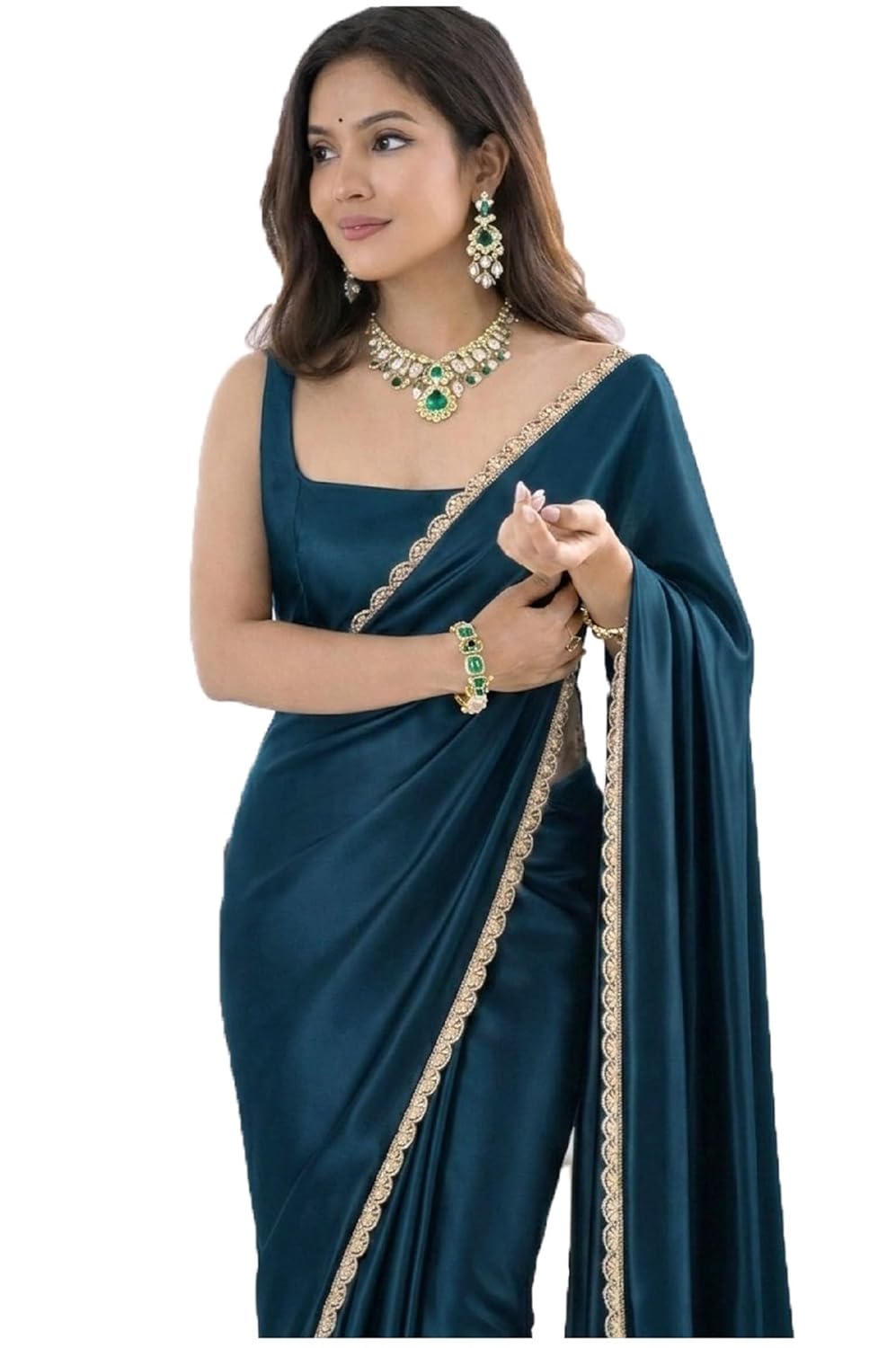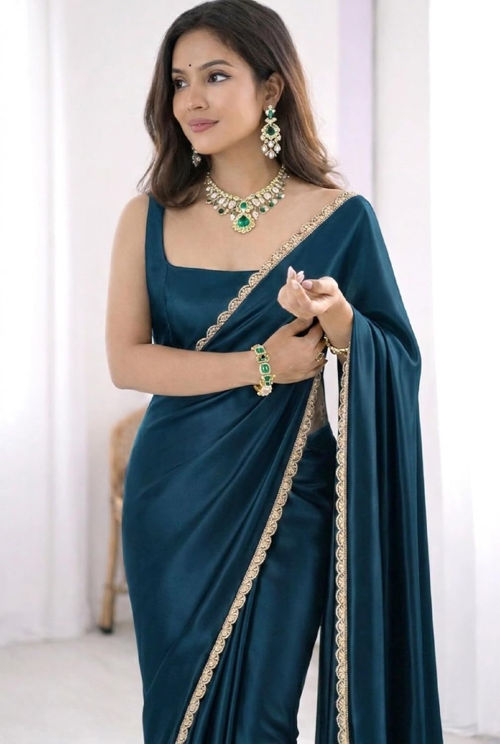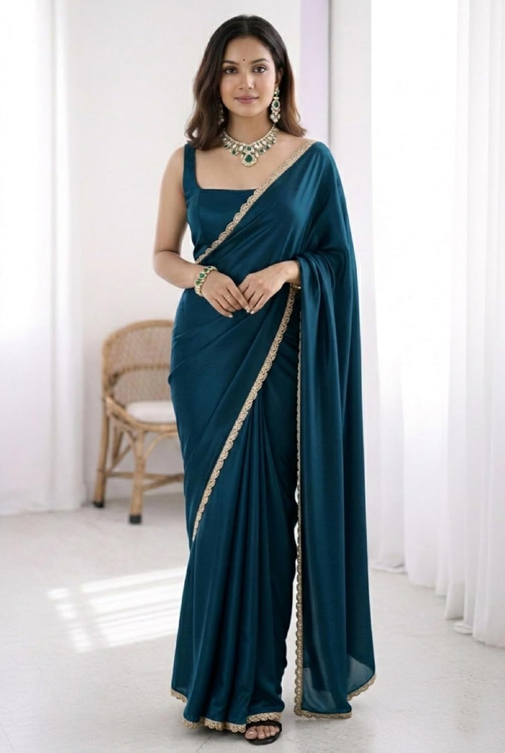 Enhance your ethnic collection with the timeless elegance of the Satin Silk Saree for Women in classic color. Designed for modern women who value convenience and sophistication, this saree blends traditional charm with contemporary styling. Crafted from premium satin silk fabric, the saree offers a soft, smooth texture with a subtle glossy finish that drapes beautifully across the body. The rich color adds a bold and refined appeal, making it suitable for multiple occasions including parties, festive celebrations, wedding functions, receptions, and evening gatherings. The highlight of this saree is its delicately embroidered scalloped lace border, which enhances the overall look with fine detailing and graceful finishing. The scallop edge adds a feminine touch while maintaining a balanced and elegant appearance. The saree comes with a matching unstitched blouse piece, allowing you to customize the blouse design as per your style preference and fit requirements. Whether styled with traditional jewelry for festive occasions or modern accessories for parties, this satin silk saree from Chitaz offers versatility, comfort, and effortless elegance in one complete ensemble. Timeless Elegance with Modern Convenience Discover effortless grace with satin silk sarees designed for today’s confident woman. Smooth Satin Silk Finish Luxurious satin silk fabric offers a soft feel, lightweight comfort, and elegant shine for refined styling. Perfect for Every Celebration Suitable for parties, festive events, receptions, weddings, farewell functions, and evening gatherings. Includes Unstitched Blouse Piece Allows personalized stitching to match your preferred neckline, sleeve style, and fit. At Chitaz, we believe that tradition and modern lifestyle can beautifully coexist. Our sarees are thoughtfully designed to combine timeless ethnic elegance with contemporary convenience. Each Chitaz creation focuses on quality fabric selection, refined detailing, and wearable comfort. From festive celebrations to memorable occasions, our sarees are crafted to make women feel confident, graceful, and effortlessly stylish. Chitaz is committed to delivering designs that celebrate femininity while simplifying everyday elegance. We aim to bring versatile, comfortable, and fashion forward ethnic wear to every wardrobe.