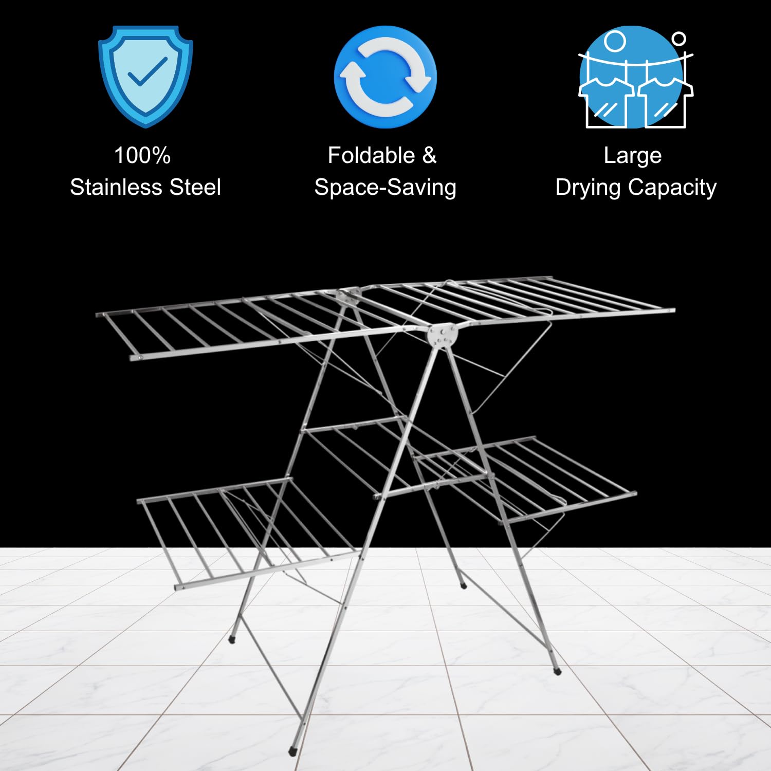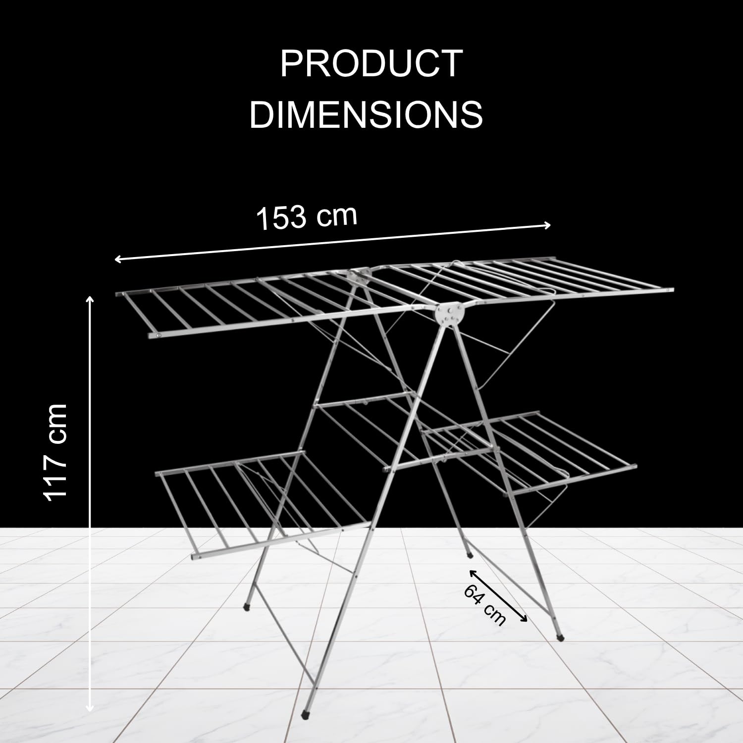 PACKAGE INCLUDES: 1 Pc Cloth Drying Stand | Winger SS Pattern | Material: Premium Stainless Steel | Dimensions: 117 x 153 x 64 cm LARGE DRYING CAPACITY: Perfect cloth drying stand for balcony or home use. Easily dries clothes, towels, bedsheets & more in one go. FOLDABLE & SPACE-SAVING: Compact, collapsible design – ideal for apartments, small rooms, and balconies. Easy to fold & store when not in use. INDOOR & OUTDOOR USE: All-weather clothes drying rack – use it indoors on rainy days or outdoors in sunlight. QUICK DRYING DESIGN: Sturdy rods with wide spacing ensure better airflow for faster, wrinkle-free drying.”