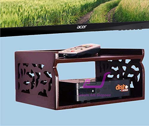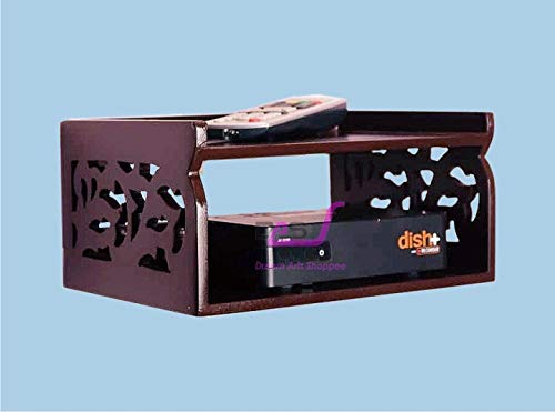 Home Furniture Shoppee Set Top Box Stand Wall Shelf & WiFi Modem Display Rack for Living with Side Craving Cutting Design (Brown)
