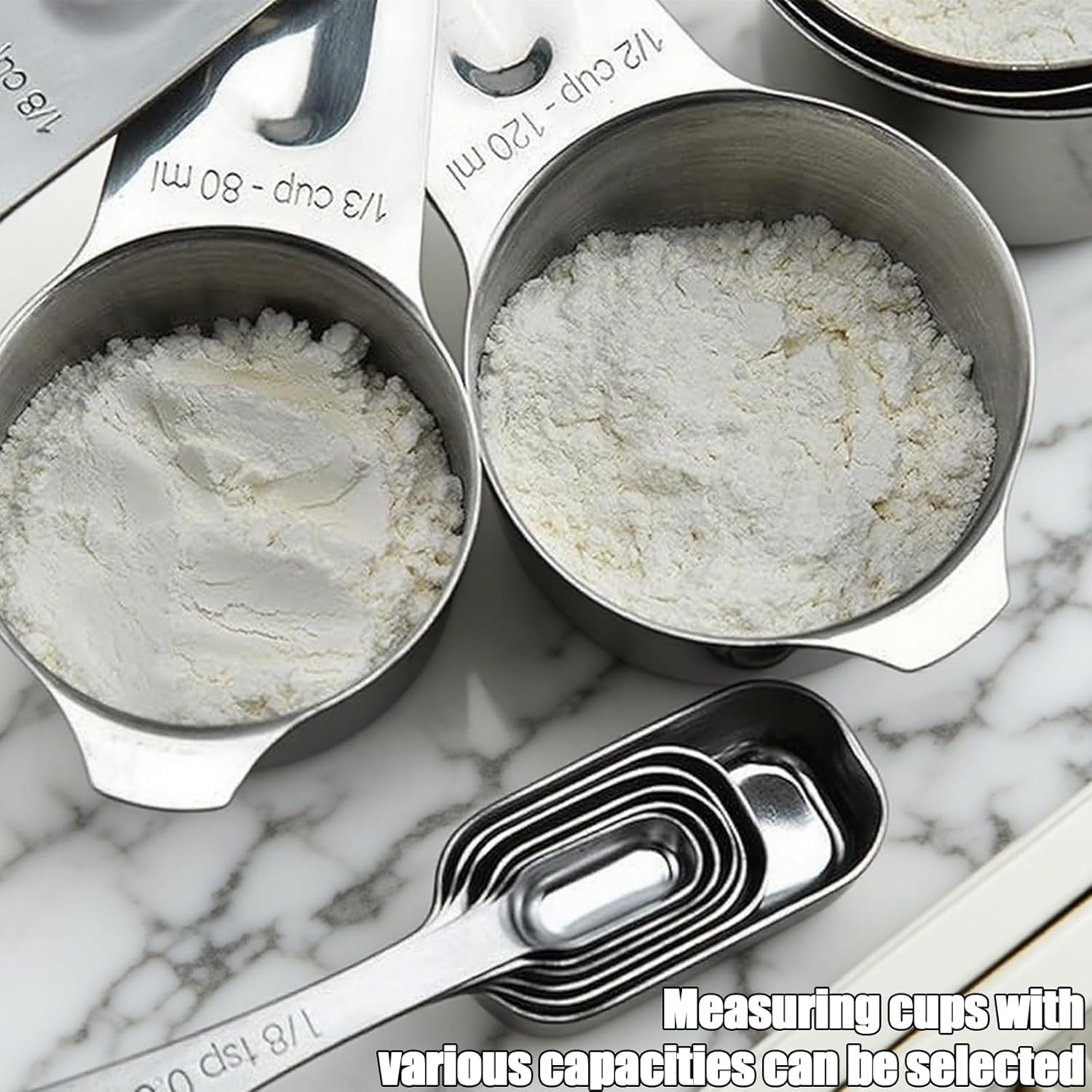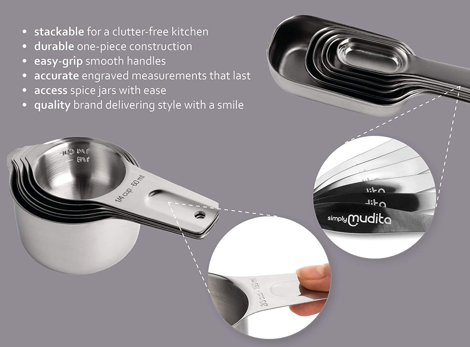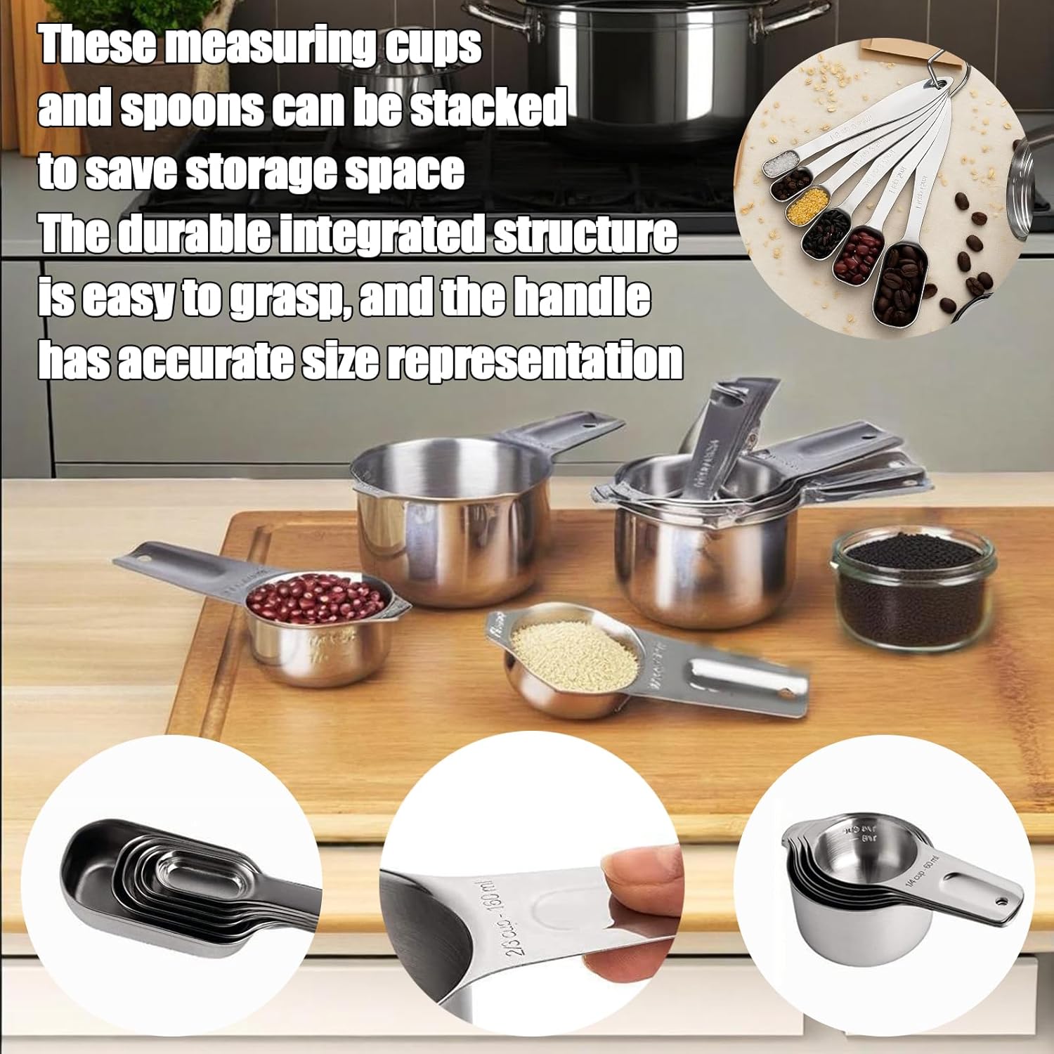NO MORE GUESSWORK; engraved easy read markings on our professional food grade utensils will never rub off or fade unlike other sets; our utensil accuracy is lab-tested giving the best results when cooking and baking; our beautifully packaged stackable set is the ideal gift and includes the following cup measurements 1/8, 1/4, 1/3, 1/2, 2/3, 3/4, 1 cup and spoon measurements 1/8, 1/4, 1/2, 3/4, 1 teaspoon, 1 tablespoon; conveniently use the 1/8 cup as a coffee scoop