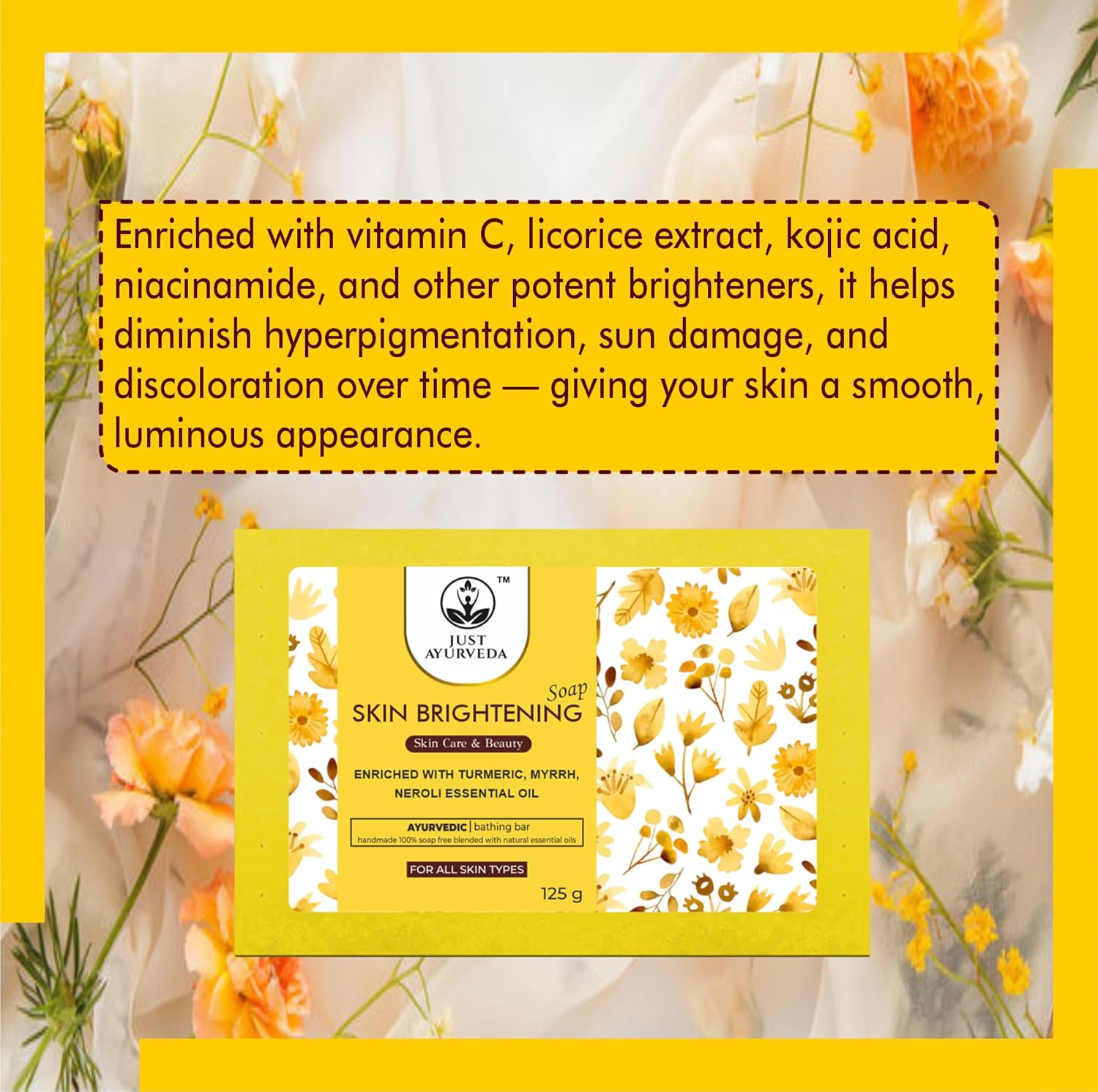 Discover the ancient wisdom of Ayurveda with Just Ayurveda’s Skin Brightening Soap, a handcrafted bathing bar that combines traditional ingredients with modern skincare science. This 125g soap is enriched with powerful natural ingredients including turmeric, known for its brightening properties, myrrh for its rejuvenating effects, and neroli essential oil that helps maintain skin’s natural radiance. The 100% soap-free formulation is gentle enough for all skin types, making it perfect for daily use. Each bar is carefully blended with natural essential oils to create a luxurious bathing experience while working to enhance your skin’s natural glow. The handmade preparation ensures that each ingredient’s beneficial properties are preserved to deliver optimal results. This Ayurvedic bathing bar offers a holistic approach to skincare, combining centuries-old wisdom with premium ingredients for a truly indulgent cleansing routine.