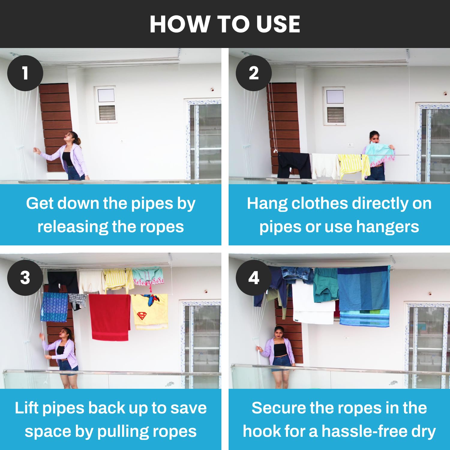 ✔️EASY TO USE- Takes up zero floor space. cloth stand for drying clothes can be pulled down conveniently via high quality pulley mechanism. Straight rods are very useful for drying large clothes like sarees, bedsheets, etc. Ideal for placement in your balcony 6 pipe 6 rodes.
