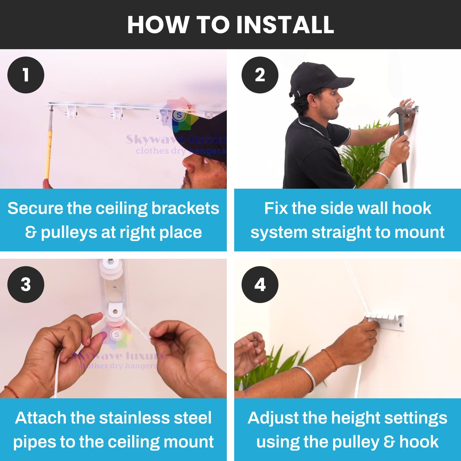 ✔️LONG LIFE- ceiling cloth hanger has metal pulley rail and metal hook plate that last long, High Quality Pulley mechanism helps moving the rack up and down conveniently. High Quality Stainless Steel cloth dryer for balcony roof ensures a very Long Product Life. Nylon Rope used is UV protected which makes product durable iron brackets.