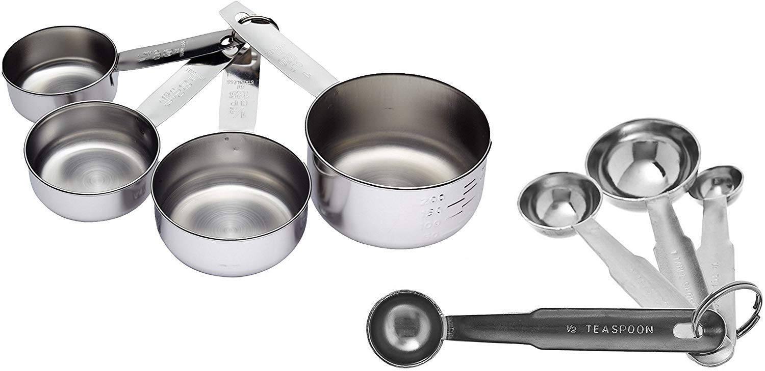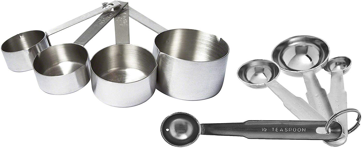 Stainless Steel Measuring Cups and Spoons Set – 8 Pieces All our products are made of 18/8 Food Grade Stainless Steel and BPA less . Uses: This measuring cups and spoons set is best for measuring dry and liquid ingredient for cakes, breads or anything else. This are must have for cooking ninjas who love to cook food. Out products are used by top chefs in the country and are to US, Canada and Europe. Features: 18/8 Grade Stainless Steel BPA less / Food Safe steel Strong and Durable Measuring Cups and Spoon Set Premium Mirror finish Lifetime Rust-proof warranty What is Included In The Box 4 Measuring Cups: 60ML (1/4Cup), 80ML (1/3Cup), 125ML (1/2Cup) and 250ML (1Cup) ) and 4 Measuring Spoons: 1/4 TSP, 1/2 TSP, 1 teaspoon, and 1 tablespoon Material 18/8 Grade Stainless Steel