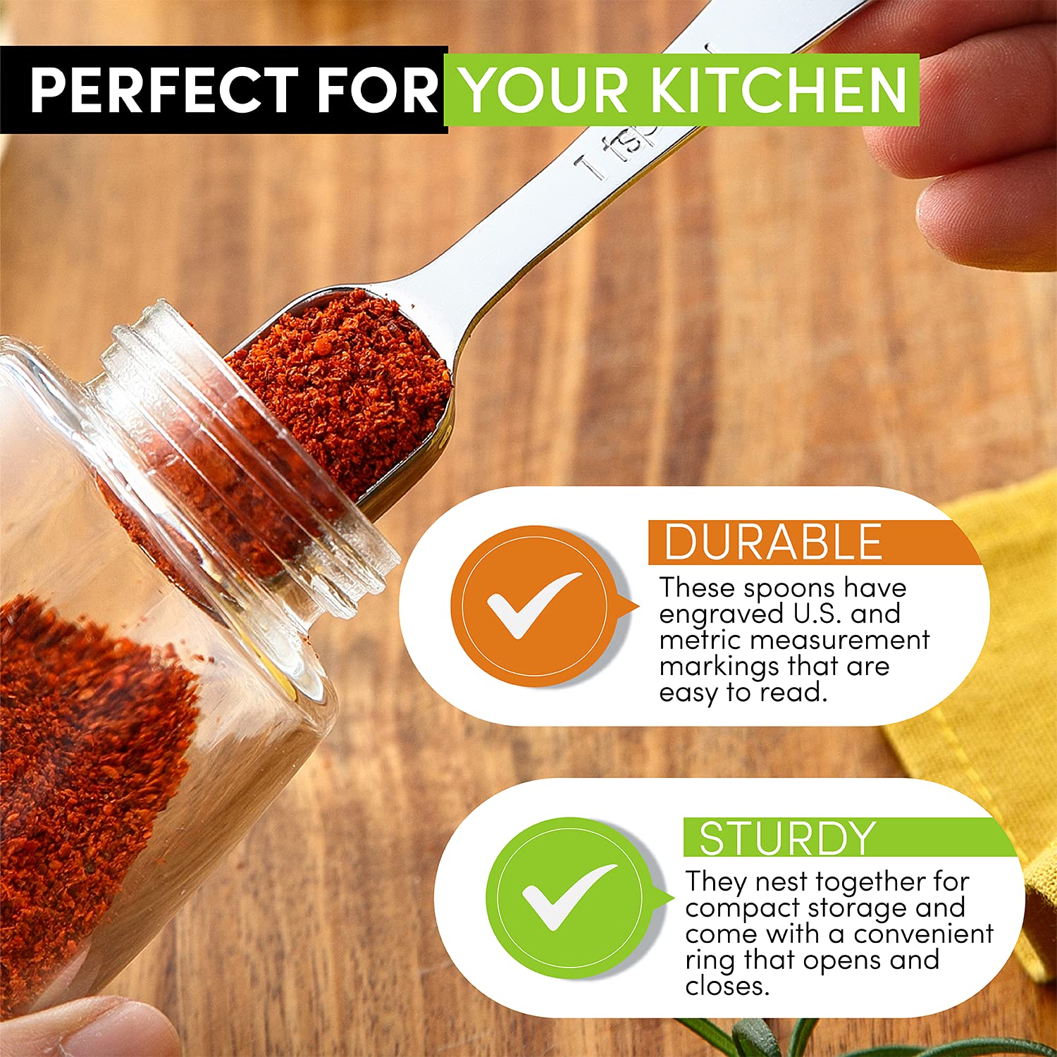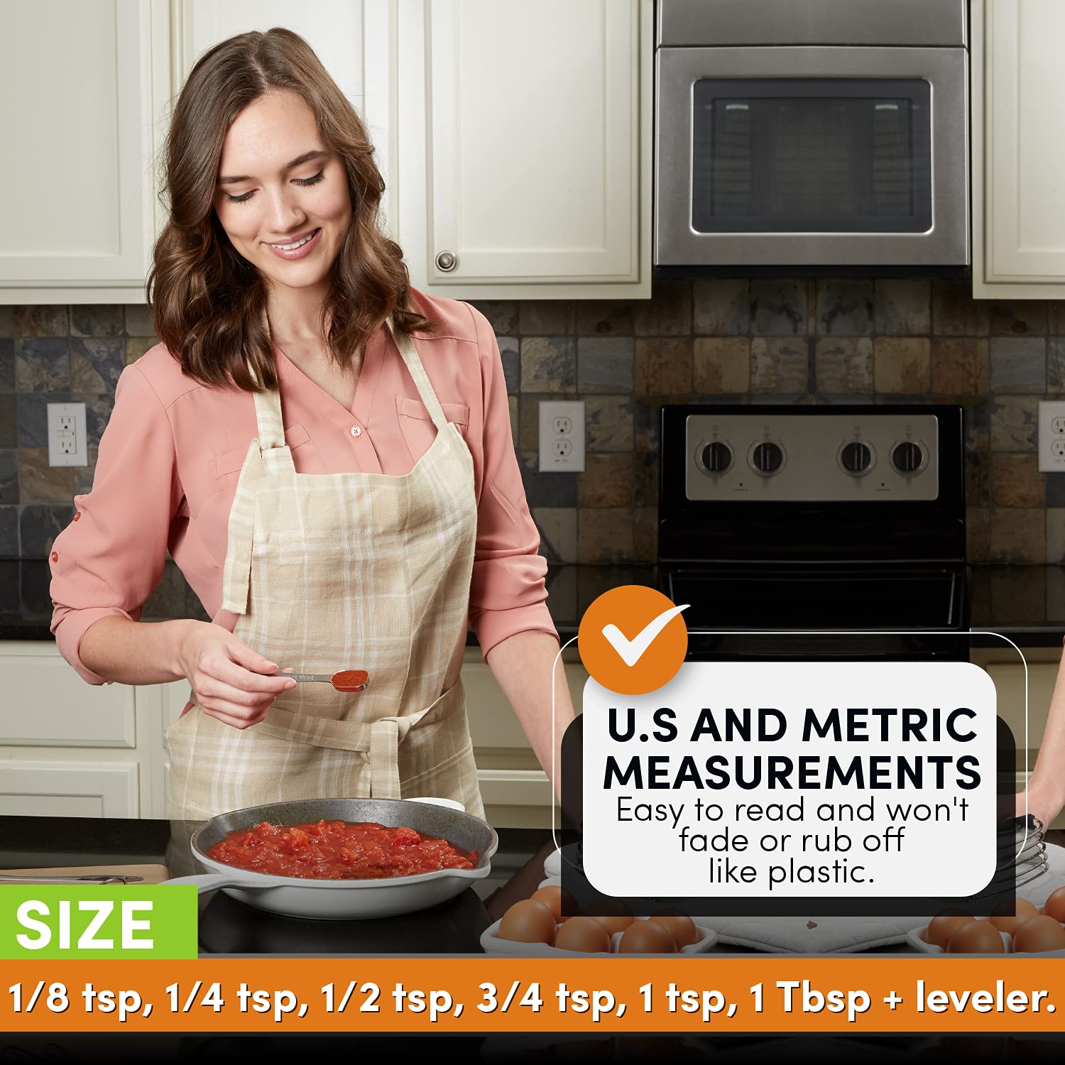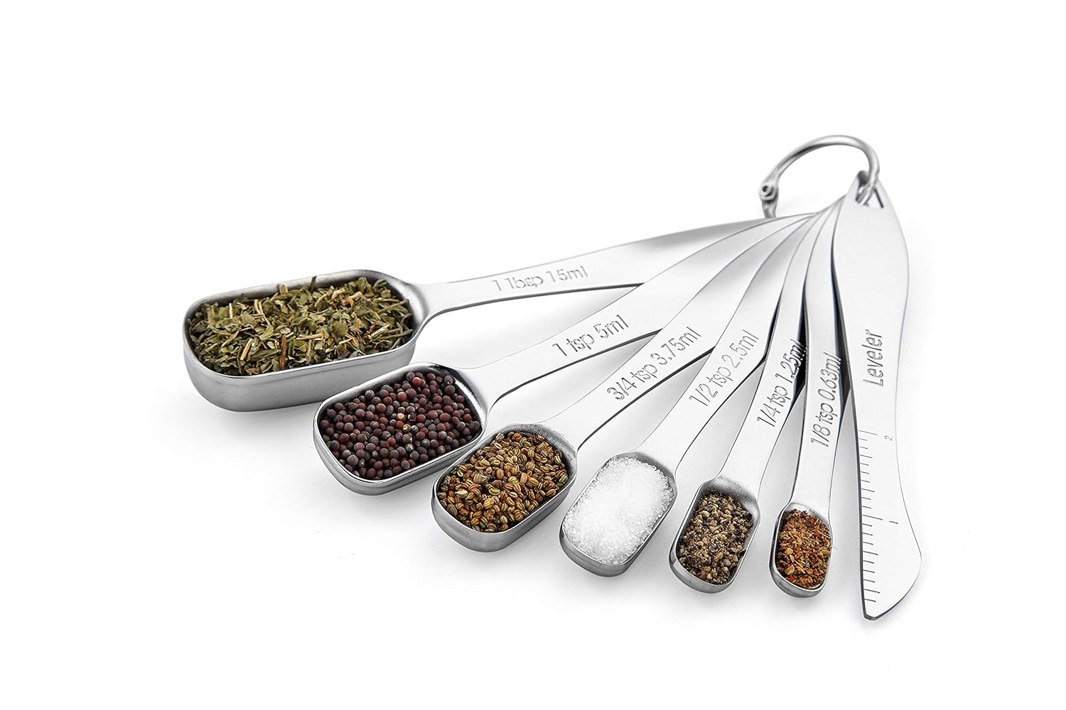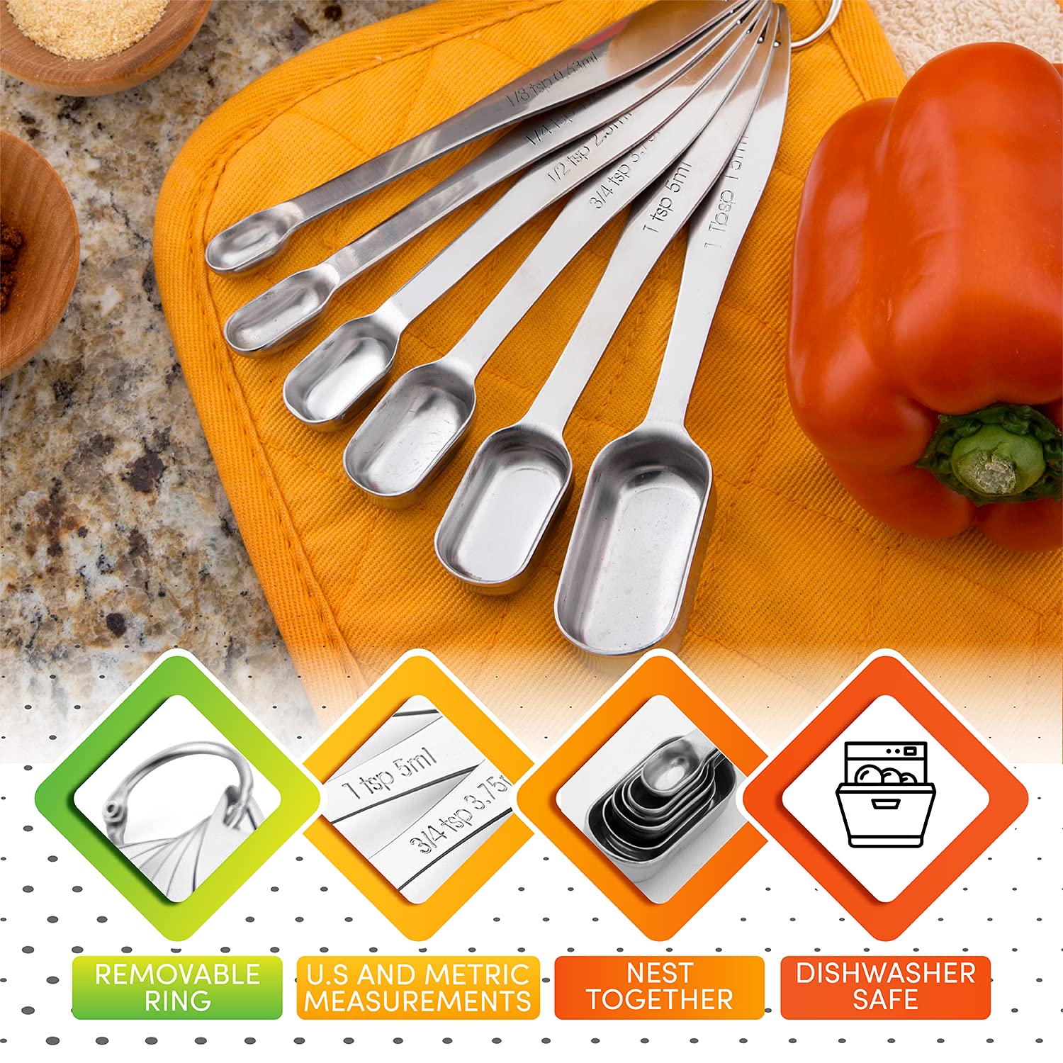 Dishwasher Safe. 6 Convenient Sizes: 1/8 tsp, 1/4 tsp, 1/2 tsp, 3/4 tsp, 1 tsp, 1 Tbsp
