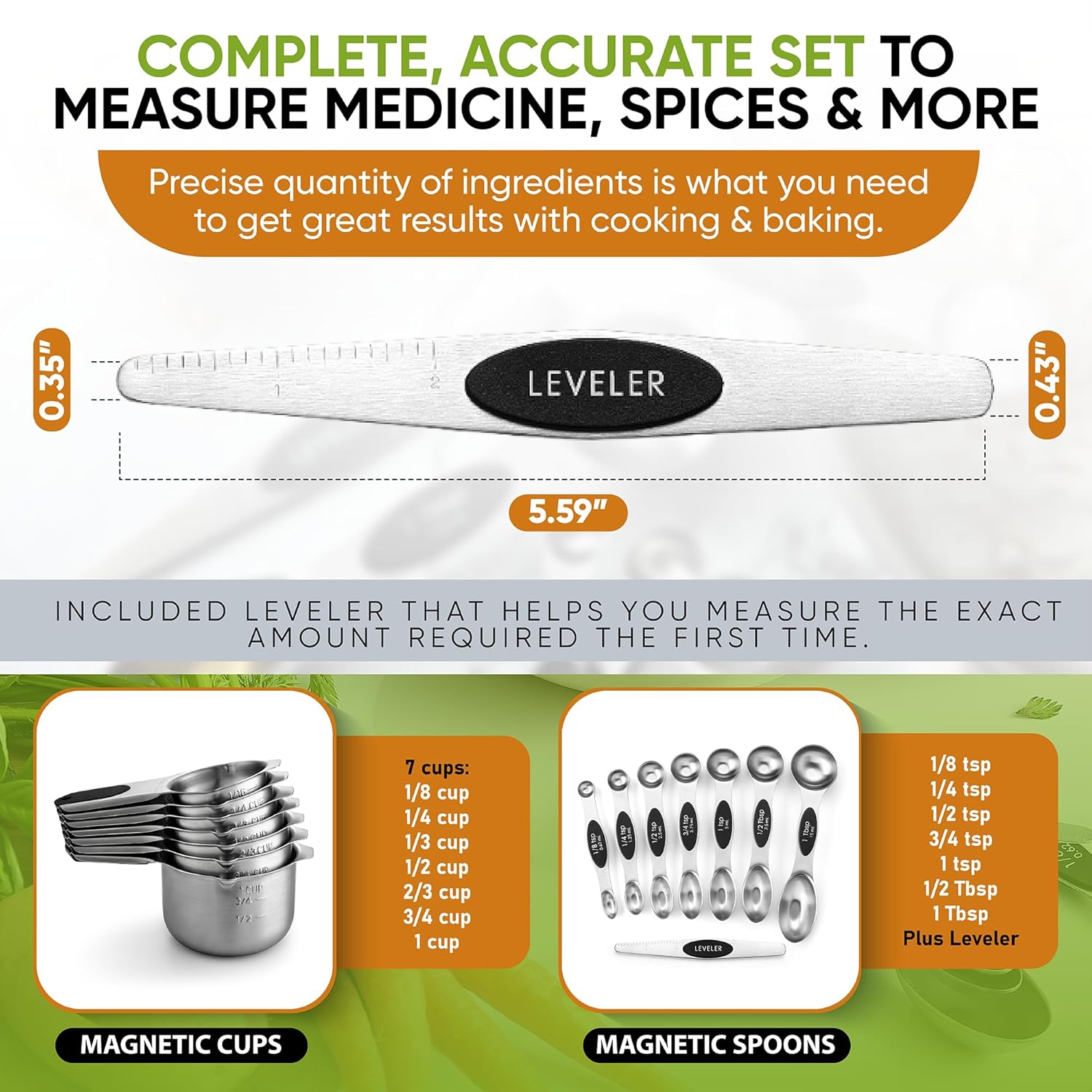 Set Includes 7 spoons in Convenient Sizes: 1/8 tsp, 1/4 tsp, 1/2 tsp, 3/4 tsp, 1 tsp, 1/2 Tbsp, 1 Tbsp plus Leveler and 7 cups: 1/8 cup, 1/4 cup, 1/3 cup, 1/2 cup, 2/3 cup, 3/4 cup, and 1 cup.