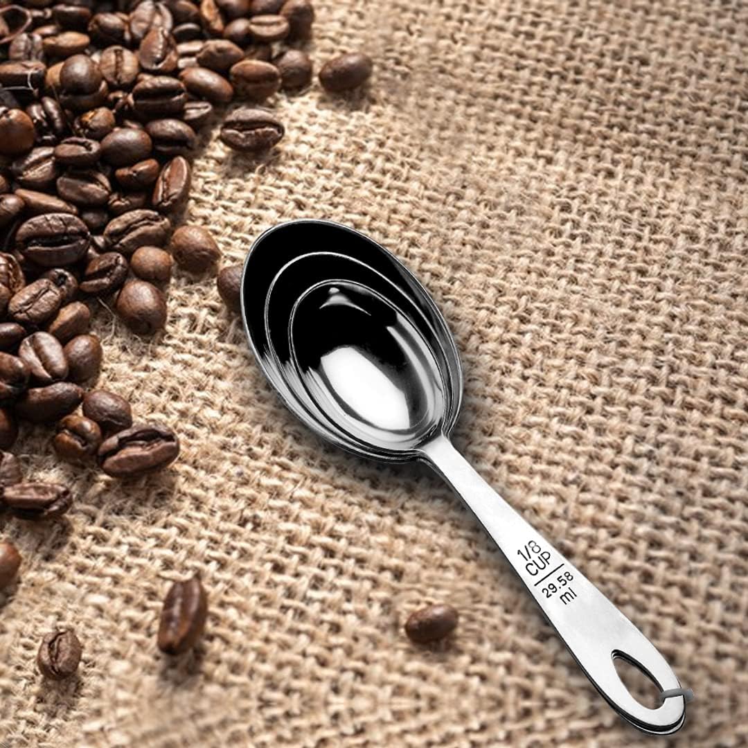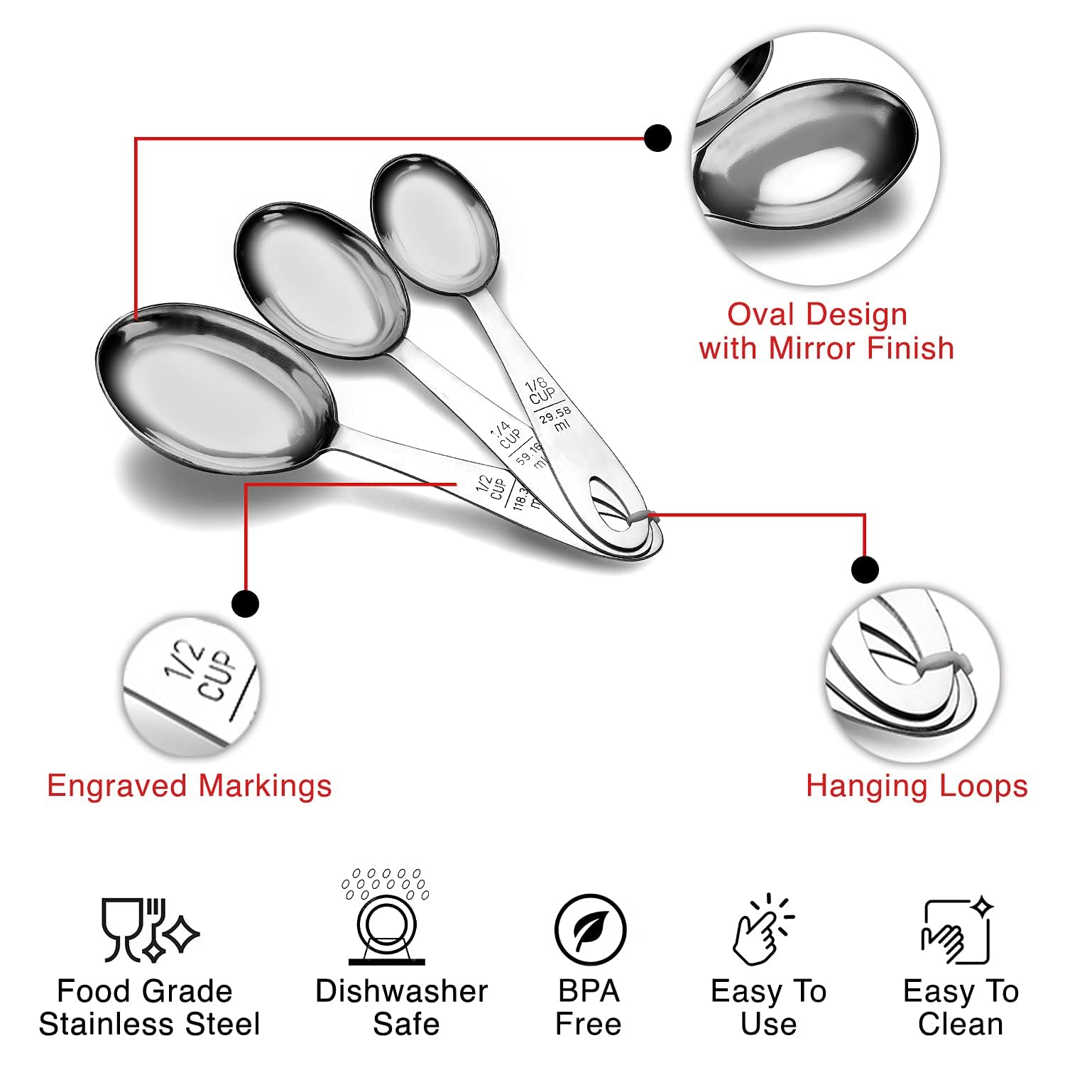 EASY TO USE: The measuring cups set features an oval design for stability and a long, sturdy, and thick handle that allows an easy reach to hard spaces like jars and deep containers. Each piece has easy to read engraved markings which will never fade. Nesting cups and spoons ensure easy, compact storage.