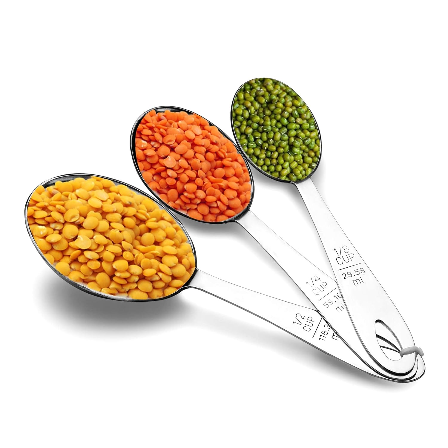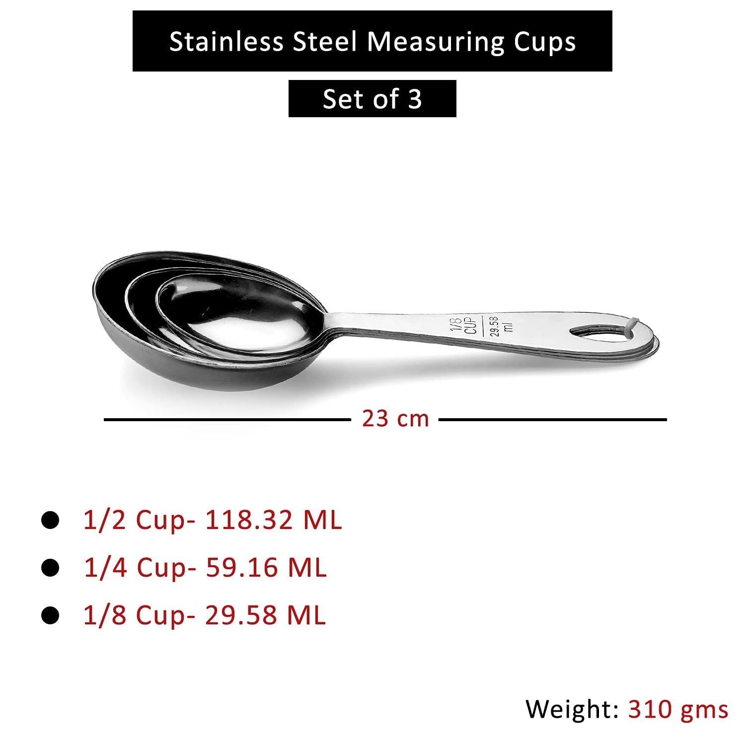 ENGRAVED MEASUREMENT WILL NEVER RUB OFF: Our engraved metric measurements which is easy to read and will not rub off. To ensure accurate measuring in cooking/baking, this measuring cup set includes 1/2 cup, 1/4 cup, 1/8 cup.