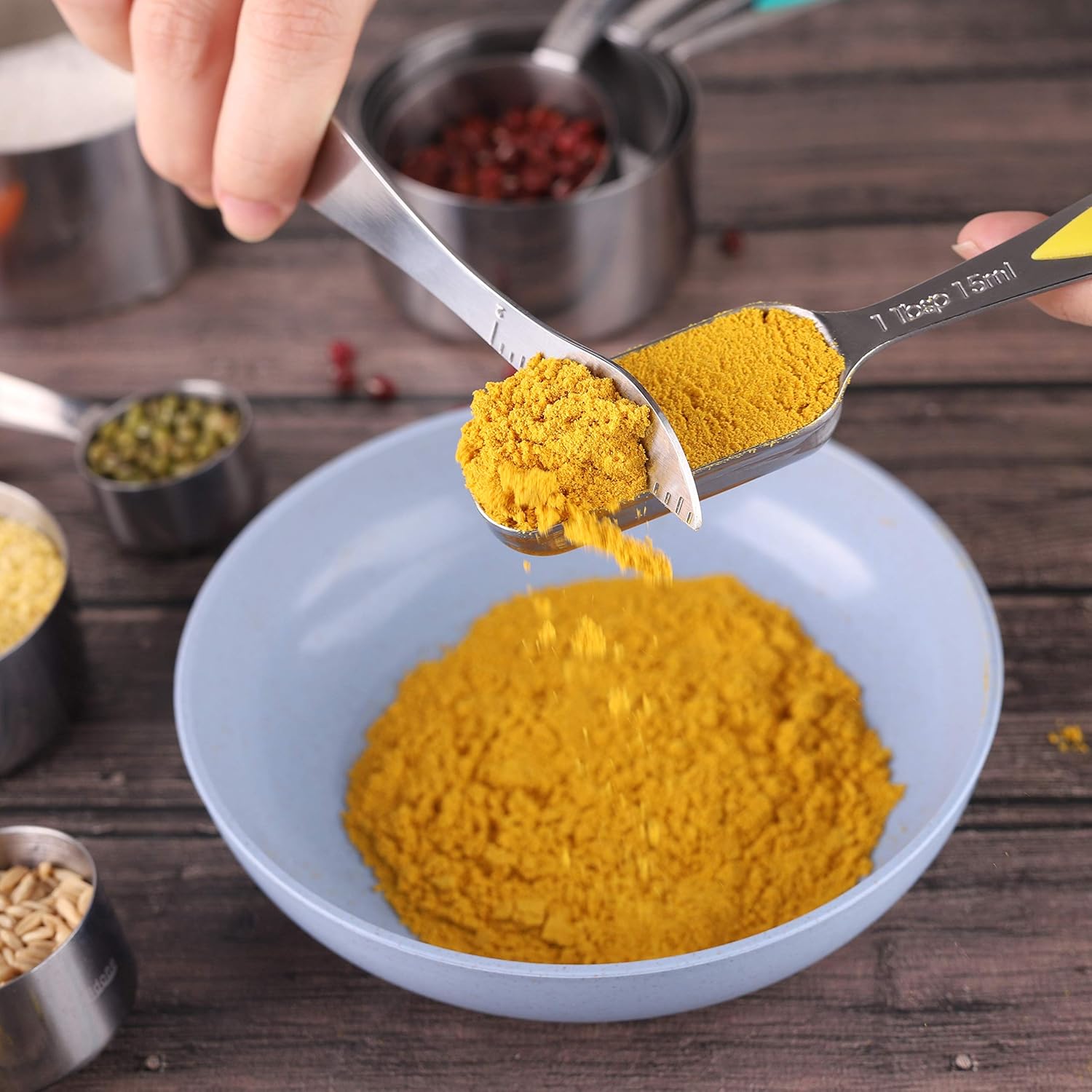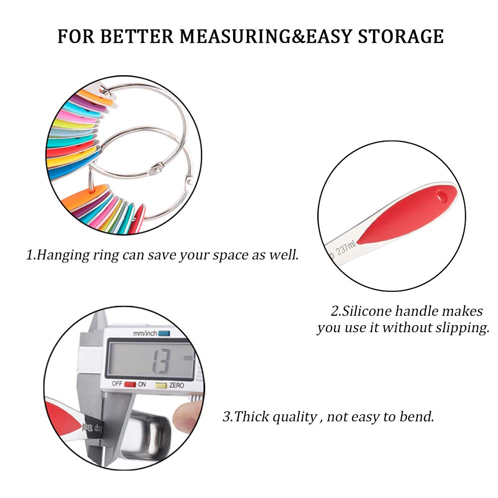 [Measurement mark] Each cup and spoon is engraved with us and metric measurement marks, which is easy to read and allows you to determine the quantity when cooking. The clear and bright color of the handle will help you easily identify the cup you need.