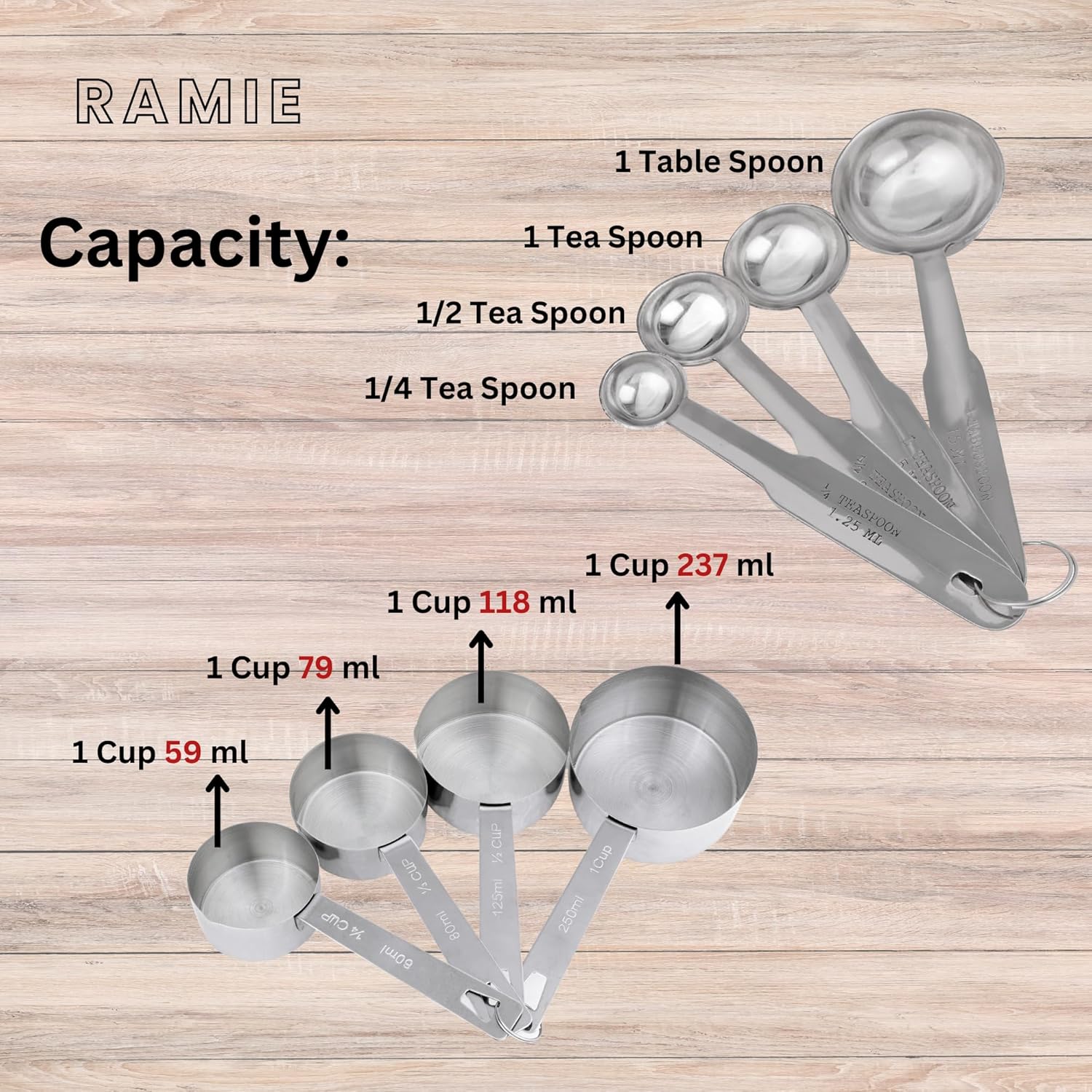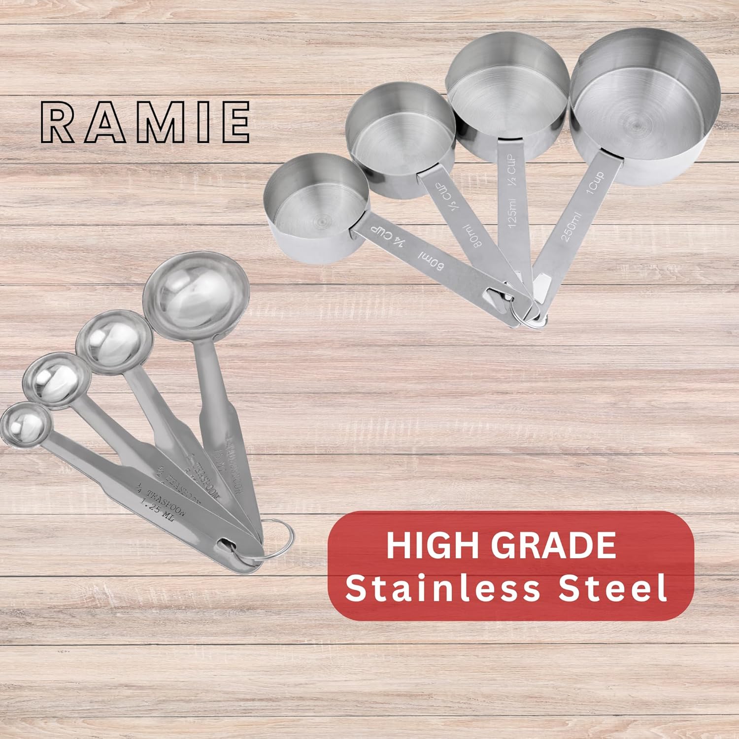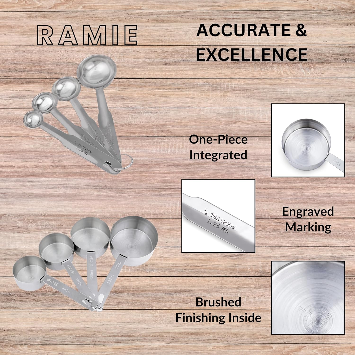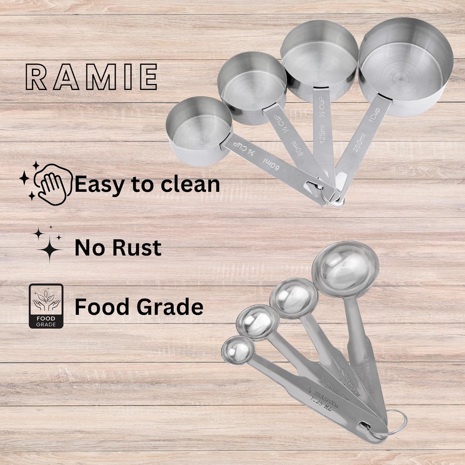 Measuring Cups and Spoons have ultra fine stainless steel construction, Matte finished surface, smooth edges to ensure safety, no rough spots or scratch marks
