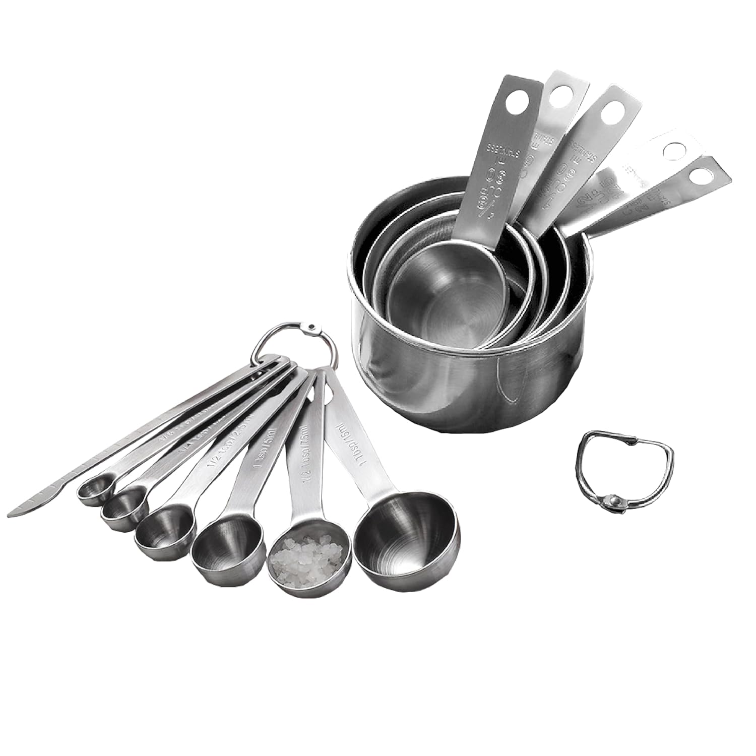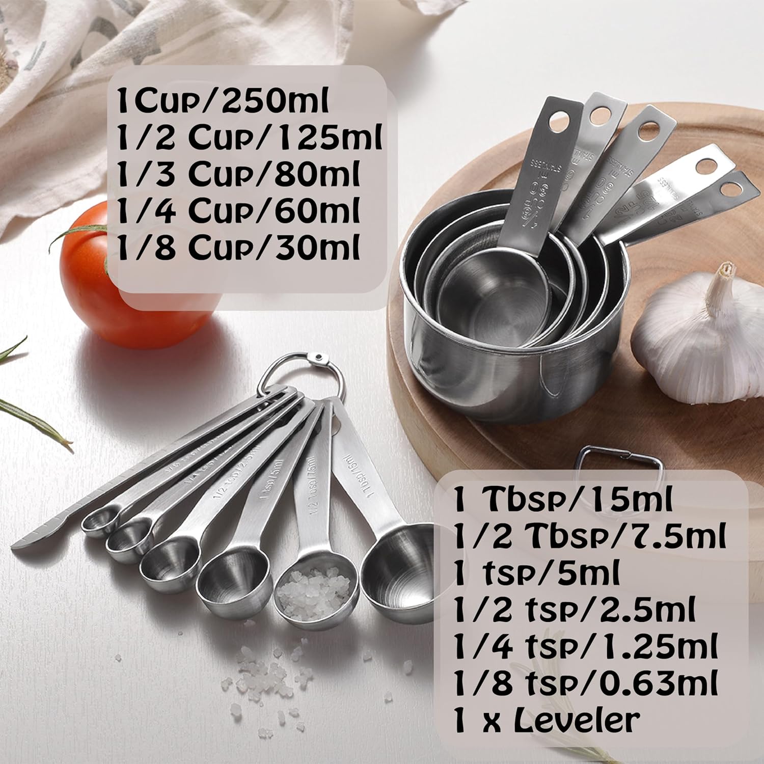 MULTIPLE SIZE:Including 13 Pcs Total ,5 Measuring Cups , 1Cup/250ml ,½ Cup/125ml, ⅓ Cup/80ml, ¼ Cup/60ml, ⅛ Cup/30ml ,7 Measuring Spoons ,1 Tbsp/15ml ,1/2 Tbsp/7.5ml ,1 tsp/5ml ,1/2 tsp/2.5ml ,1/4 tsp/1.25ml,1/8 tsp/0.63ml,1 x Leveler, Marked on handle.Meet All Your Needs For Cooking And Baking.