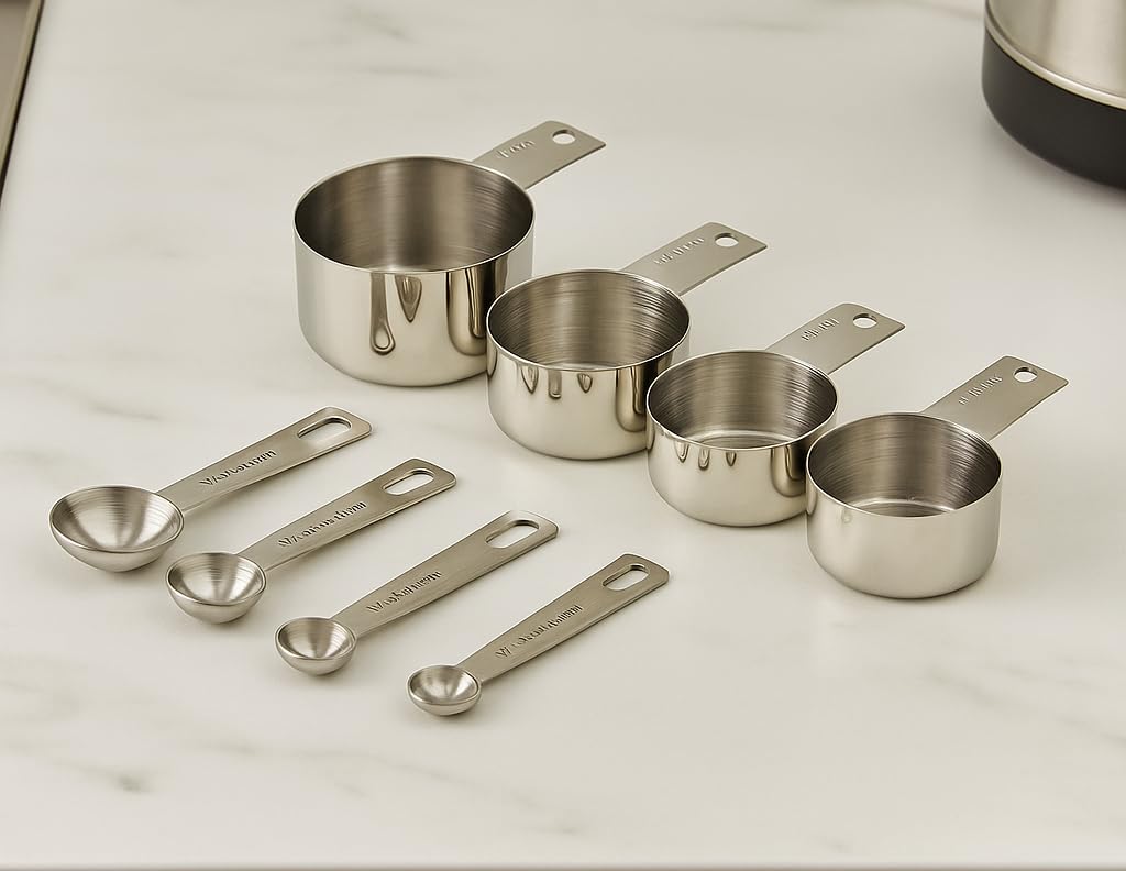 Complete 8-Piece Set – Includes 4 measuring cups (1 cup/250ml, 1/2 cup/125ml, 1/3 cup/80ml, 1/4 cup/60ml) & 4 measuring spoons (1 tbsp/15ml, 1 tsp/5ml, 1/2 tsp/2.5ml, 1/4 tsp/1.25ml).