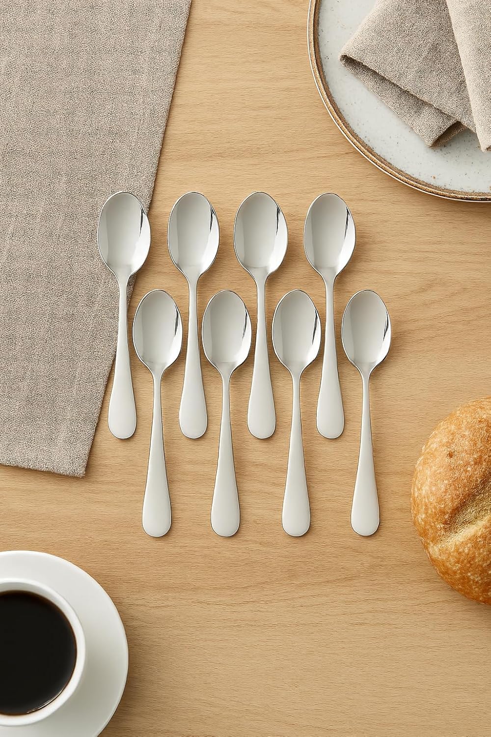 Standard Stainless Steel Spoons: Made from high-quality food-grade stainless steel, strong, rust-resistant, and safe for everyday dining use.