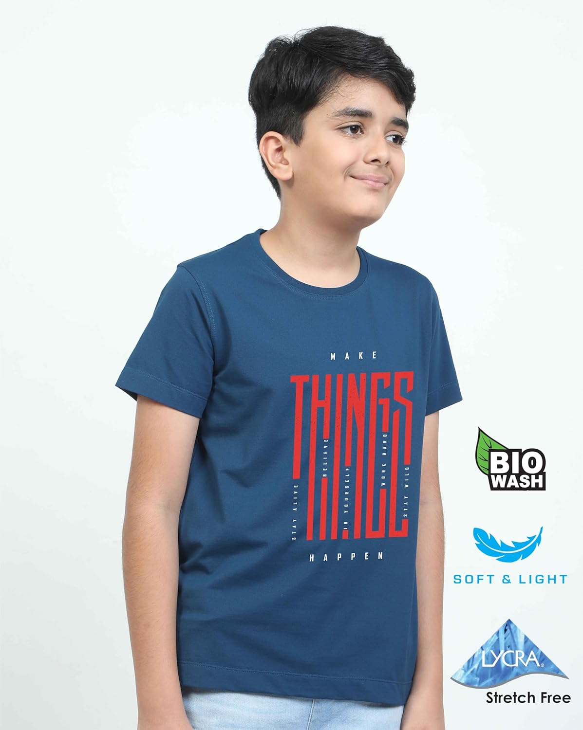 Spiumo Cotton Boys Crew neck Make Things print crew neck T-Shirts are a symphony of comfort. Exquisite collection of blended cotton with lycra, where comfort meets style in the most captivating way. Crafted with the finest quality cotton, these tees offer a blend of luxurious softness, comfort and enduring durability.