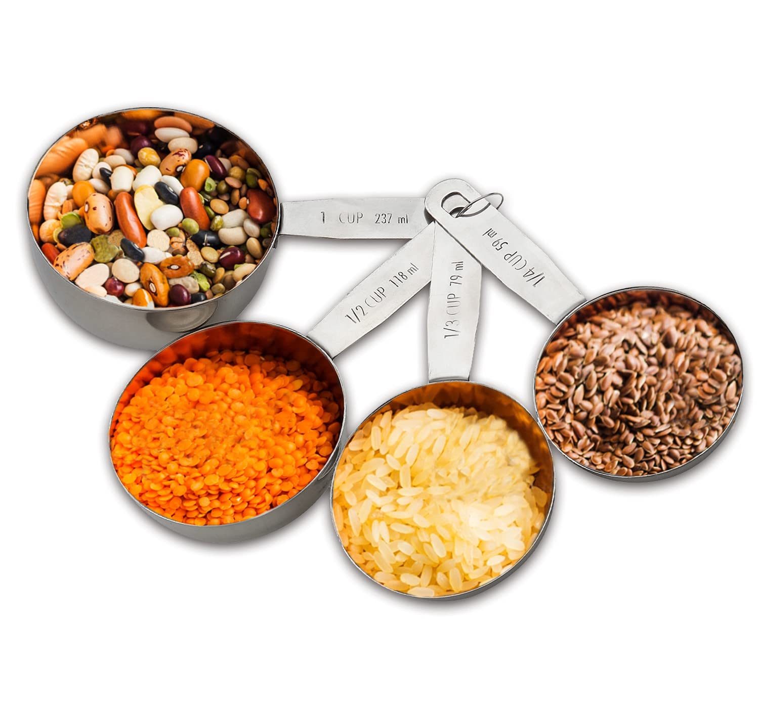 Steren Impex | Stainless Steel – Measuring Cup | – Round ( Set of 4) (1, 1/2, 1/3 & 1/4 Cup)Steren measuring cup are made of premium grade non-magnetic, rust resistant Stainless Steel.Ultra-Fine stainless steel construction, Matt finished surface, smooth edges to ensure safety, no rough spots or scratch marks.Metric measurements are engraved on the spoons very clearly and won’t fade or rub off even after continuous washing and usage.Beautiful & Elegant design with proper gauge thickness, long & strong handle grip to hold comfortably. Dishwasher Safe and recommended to wipe flatwares before storage. Consist of 4 Measuring Cups, Size – 1 Cup, 1/2 Cup, 1/3 Cup & 1/4 Cup (237 ml, 118 ml, 79 ml & 39 ml).