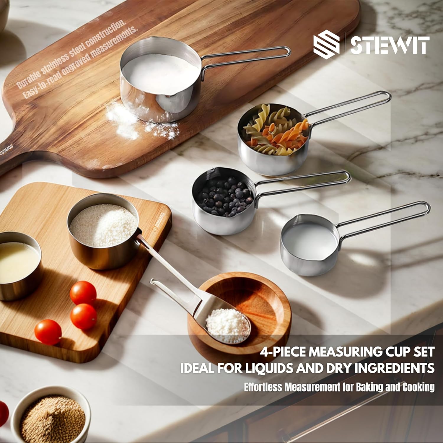 Stewit Complete Kitchen Measuring Set: 4 Stainless Steel Cups & 4 Spoons – Essential Gadgets for Accurate Recipe Preparation Ideal for Baking & Cooking Enthusiasts (Set of 4 Cups & 4 Spoons)