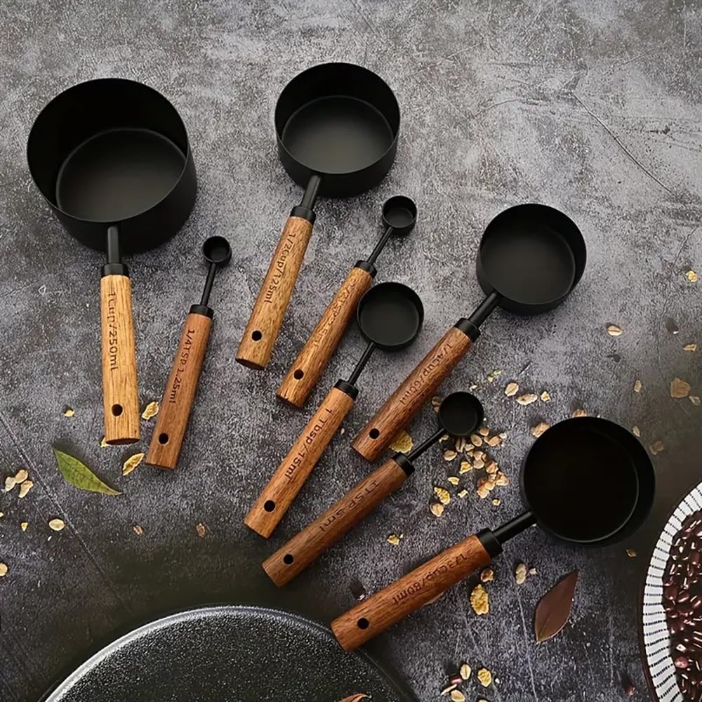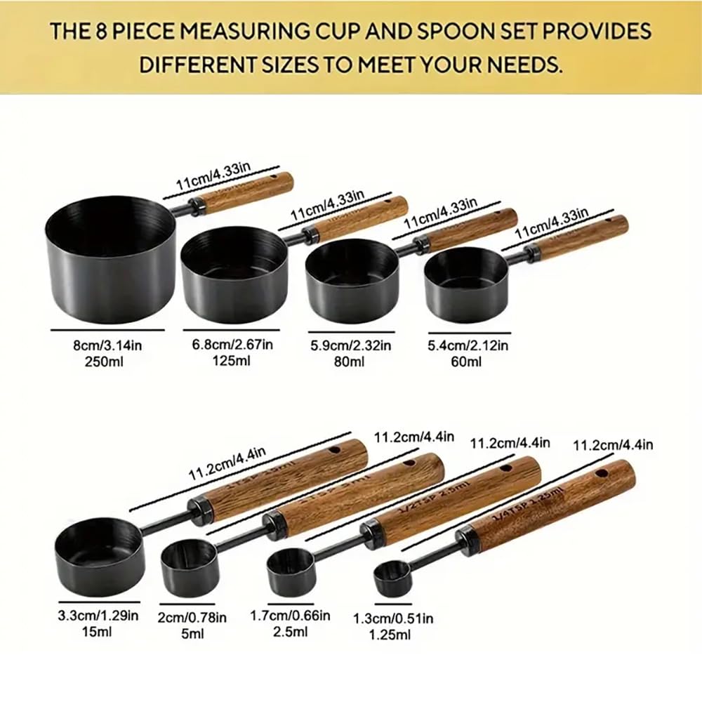 Complete Set: The set includes 4 measuring cups (1 cup, 1/2 cup, 1/3 cup, and 1/4 cup) and 4 measuring spoons (1 tablespoon, 1 teaspoon, 1/2 teaspoon, and 1/4 teaspoon), covering all your measurement needs.