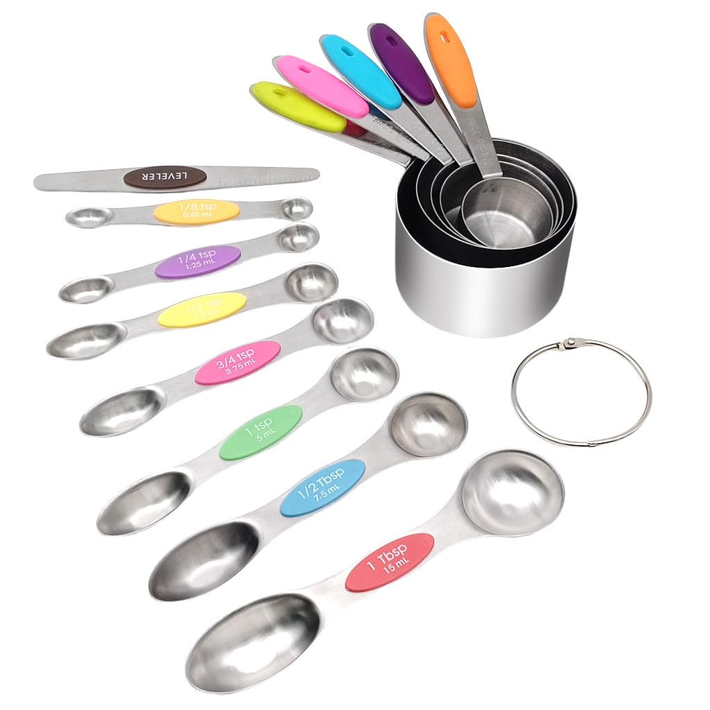 UTILITY MEASURING TOOLS FOR ALL COOKING NEEDS: Whether youre an experienced baker or a home cook, this versatile measuring spoons and cups set is ideal for all your culinary adventures, from baking cakes to daily meal preparation. The inclusion of a leveling tool ensures exact measurements and an open ring that keeps all cups and spoons neatly organized in one place.
