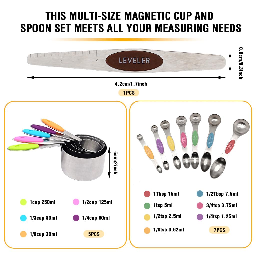 COMPREHENSIVE MEASURING SPOONS & CUPS SET: This 13pcs stainless steel measuring spoons and cups includes 7pcs dual head measuring spoons and 5pcs measuring cups, from from 1/16 tsp to 1 tsp, 1/16cups to 1cup . This comprehensive set ensures you have the perfect measuring tool for every recipe, allowing precise measurements for both dry and liquid ingredients.