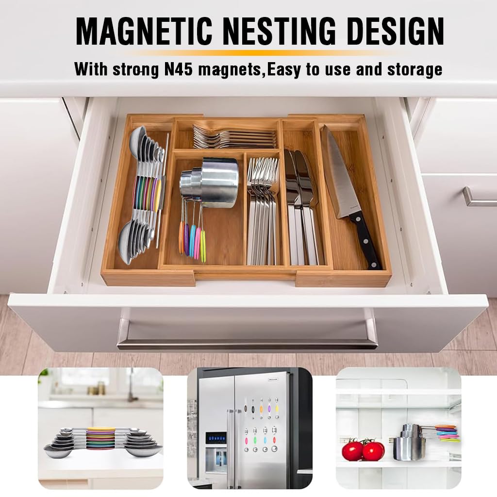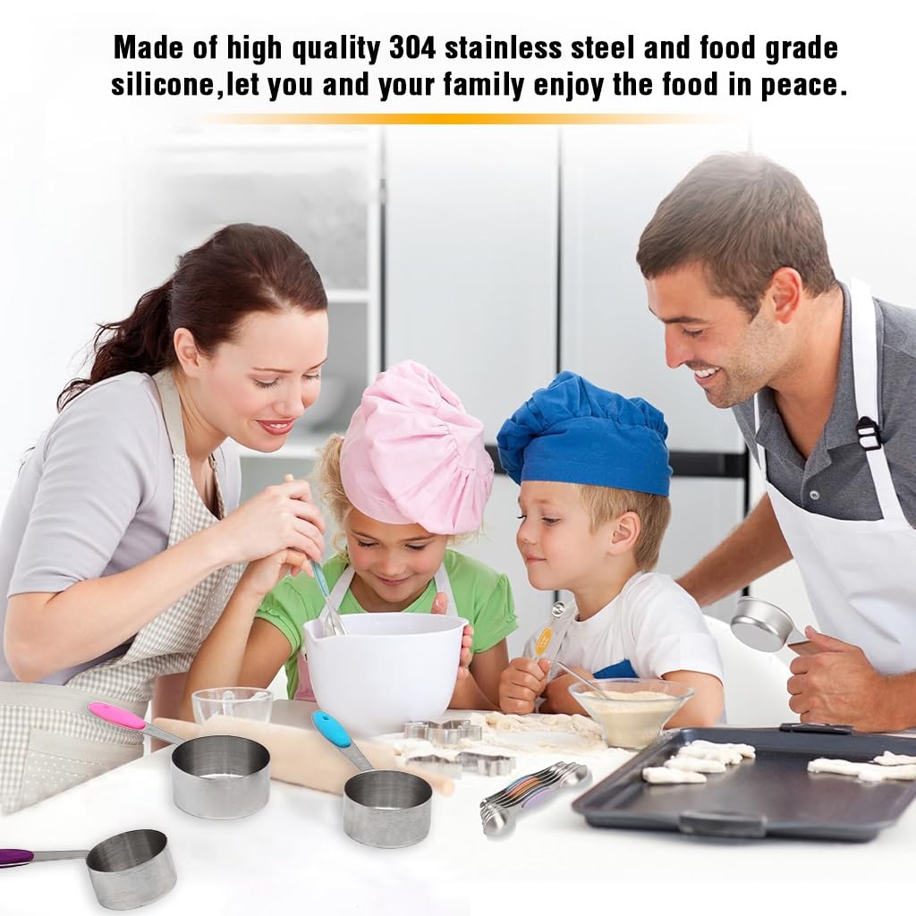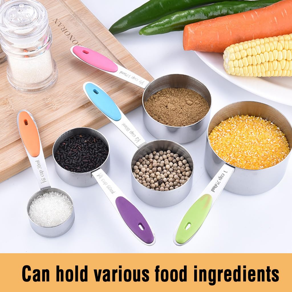 SILICONE HANDLES WITH SCALE MARKS: Each handle has a vibrant colored silicone grip with clearly engraved scale markings for better readability and precise measurements. The ergonomic silicone handle not only prevents slipping but also provides a comfortable grip, making the measuring process easier and enjoyable, whether youre baking cakes or cooking savory dishes.