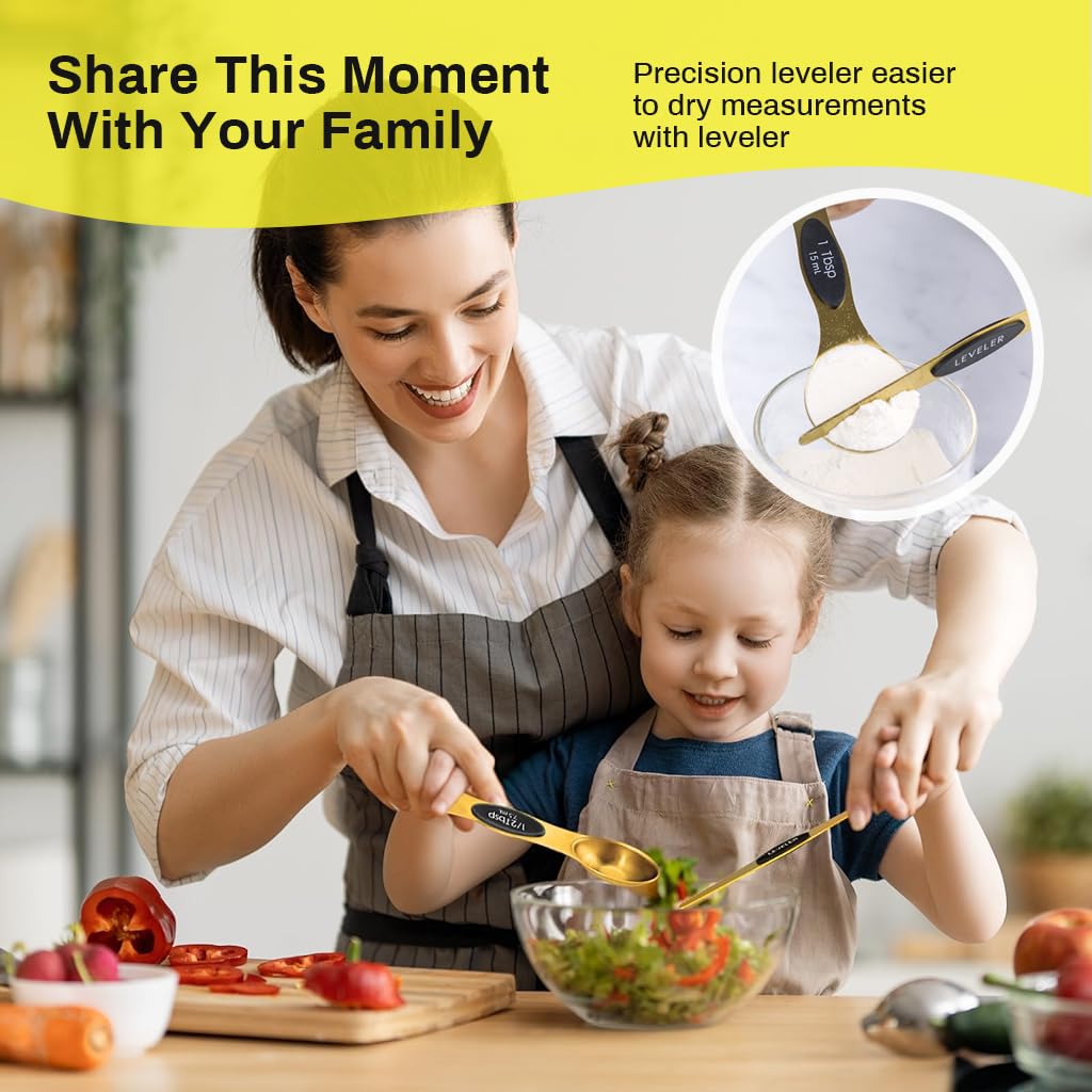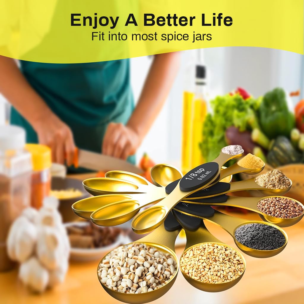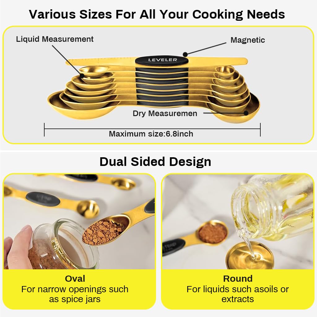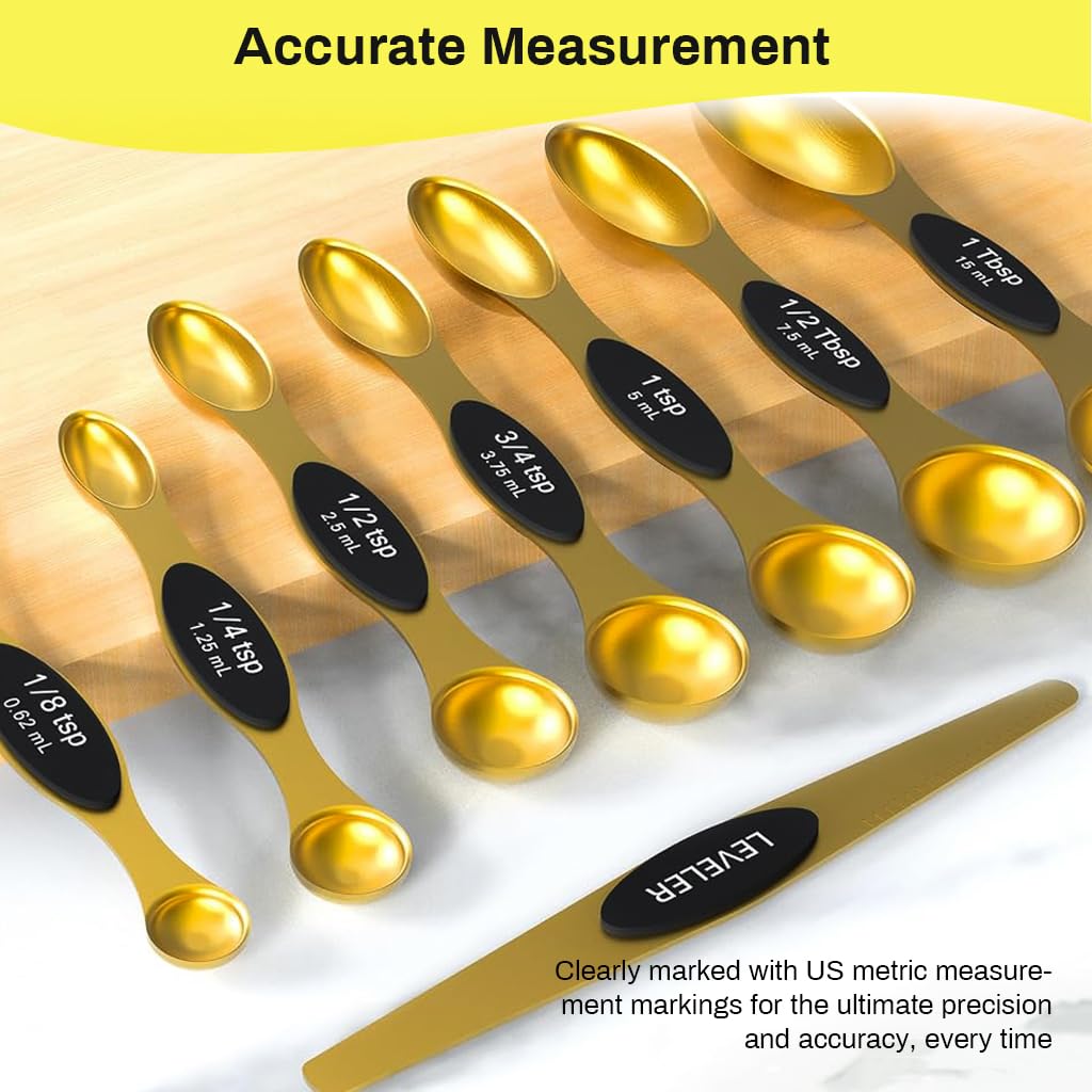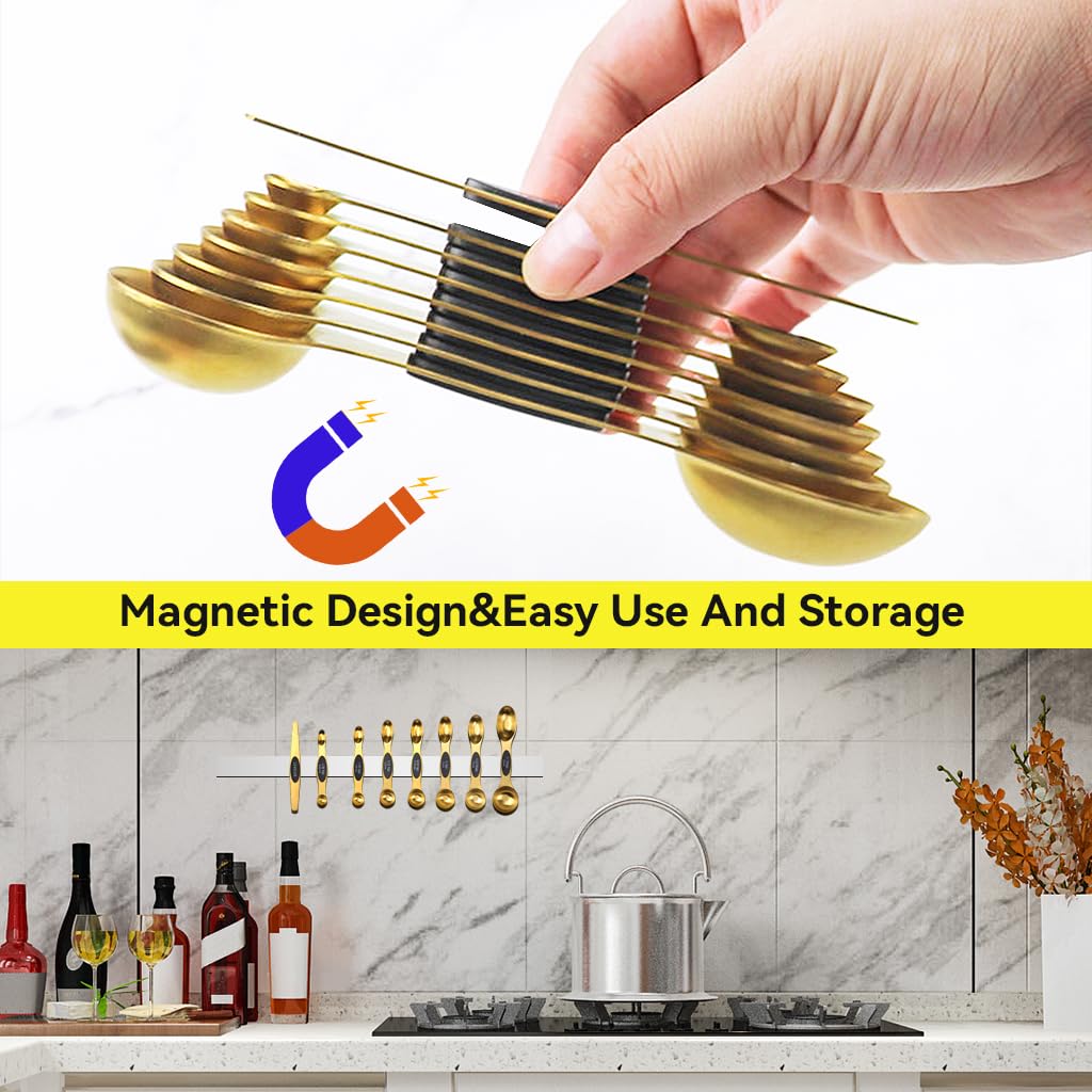 MAGNETIC FOR EASY USE AND STORAGE: These magnetic measuring spoons allow for easy use and storage. They feature a nesting design, so you can grab the spoon you need without any hassle. The strong gold magnets ensure they stick together and remain readily accessible.